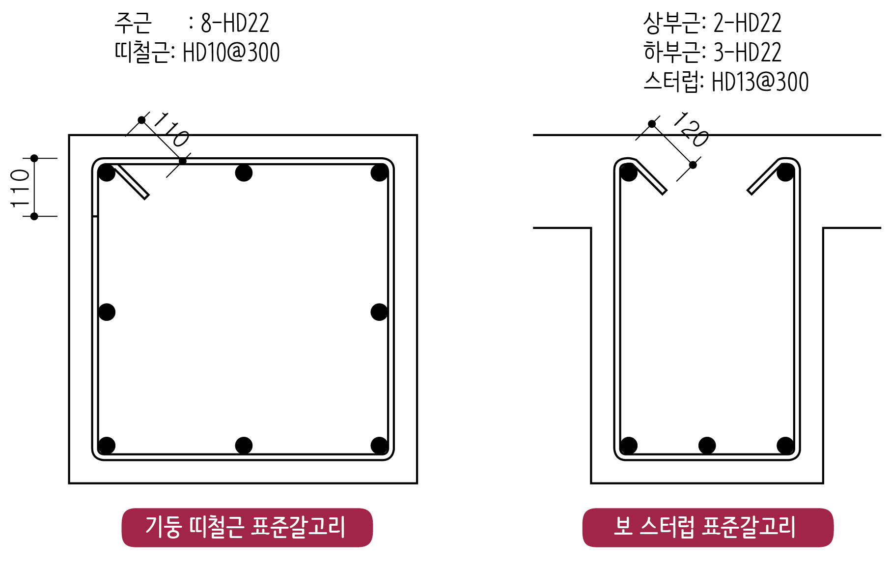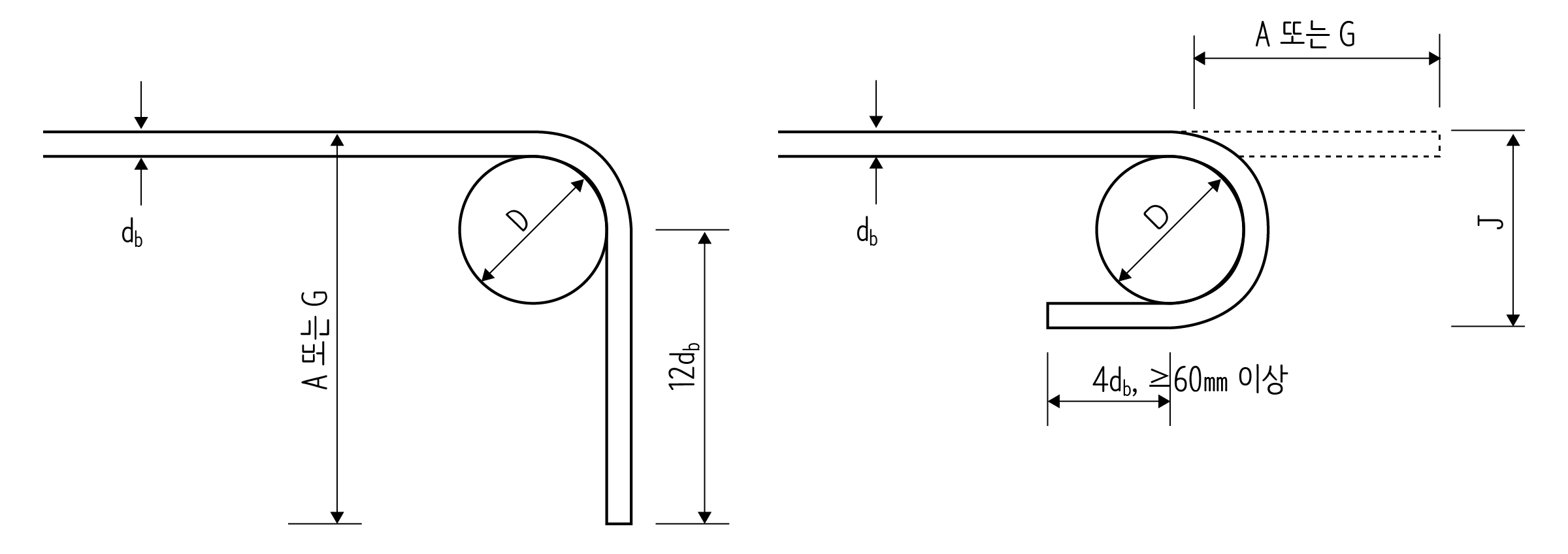 일반적으로 많이 쓰는 D10과 D13으로 된 띠철근과 스터럽의 표준갈고리를 그리면 다음과 같이 됩니다.