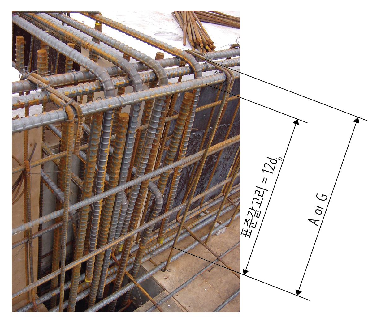 아래 사진은 보 상부 주근을 정착한 상태를 보여줍니다. 보 상부 주근이 인장력을 받을 때 뽑히지 않도록 표준갈고리를 만들어 정착합니다. 지름의 12배면 충분한데 보기에도 조금 길게 만들어진 것 같습니다. 현장에서 작업할 때는 구부러진 부분을 포함한 90°로 꺾인 부분 전체(그림에서 ‘A 또는 G’로 나타냄) 치수로 작업하는 것이 수월합니다.