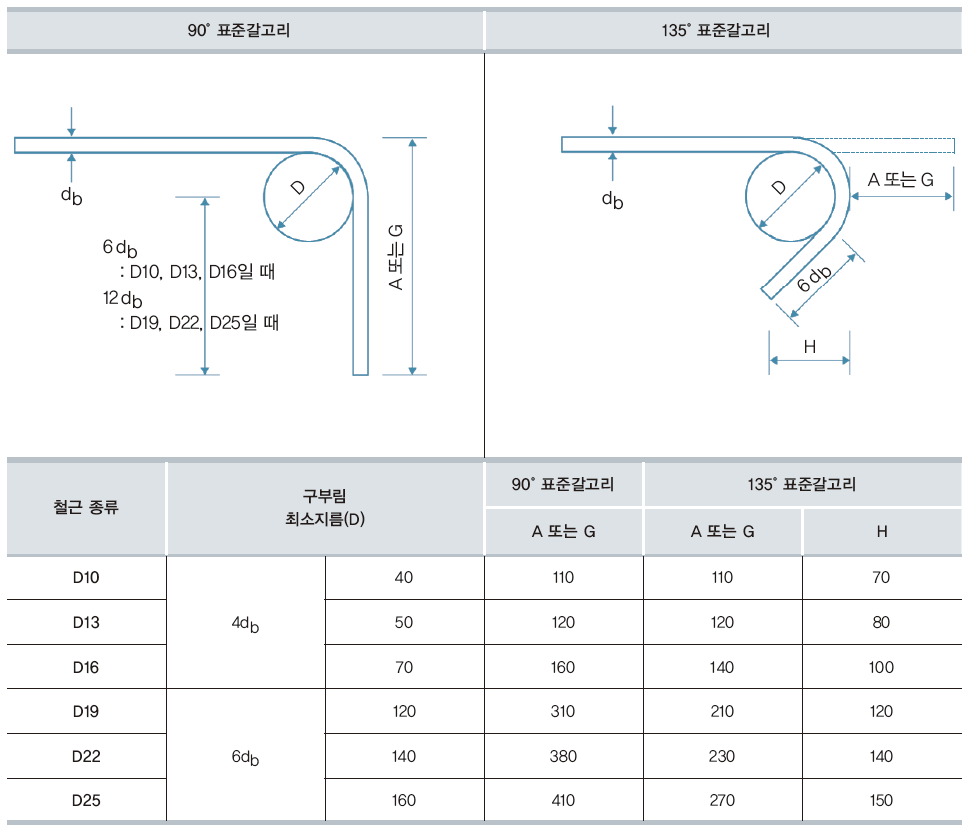 주근의 표준갈고리는 90°와 180°로 구부리지만, 띠철근과 스터럽의 표준갈고리는 90°와 135°로 구부립니다. 180°로 구부리면 주근에 끼우는 것이 매우 어렵습니다.
