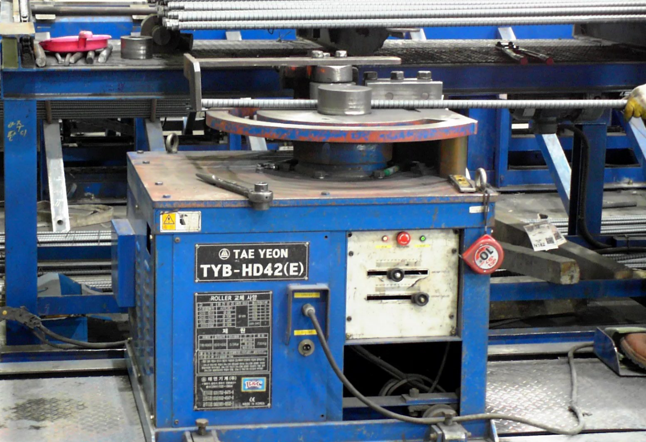 위 표에서 보면 '구부림 최소지름(D)'값이 있습니다. 이것은 철근을 구부릴 때 너무 급하게 구부리면 구부린 부분이 터지거나 파손될 수 있게 완만하게 구부리라는 의미입니다. 그래서 아래 사진처럼 절곡기 가운데 부분에 있는 둥근 원통에 끼워서 원통의 지름만큼 완만하게 구부립니다. 철근 지름에 맞게 원통 크기를 갈아 끼우면서 조절할 수 있습니다. 굵은 철근일수록 지름이 더 큰 원통을 끼워야 합니다. 예를 들어 D25 철근을 구부린다면 지름이 160(표 참조)인 원통을 끼워서 완만하게 구부려야 합니다.
