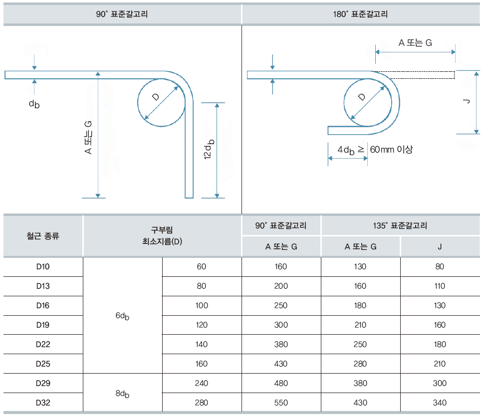 구부러진 부분을 포함한 꺾인 부분 전체(A 또는 G에 해당하는 부분)가 120mm가 되어야 하고 135°로 구부린다면 이 120mm가 되어야 합니다. 복잡하게 느껴질지 모르겠지만 표만 잘 읽어내면 될 것 같다.