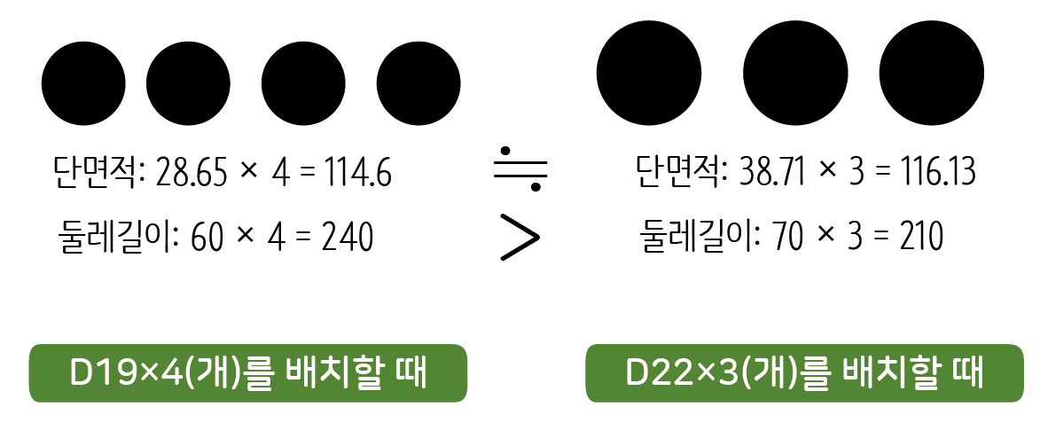 위 그림처럼 D19 철근을 네 개 배치한 것과 D22 철근을 세 개 배치한 것은 단면적이 거의 비슷합니다. 따라서 둘 다 구조적인 성능은 비슷합니다. 그러나 표면적이 꽤 차이나는 것을 알 수 있습니다. D19를 네 개 배치한 것이 원의 둘레길이가 더 늘어나 콘크리트와 만나는 표면적이 증가합니다. 따라서 콘크리트가 더 잘 붙잡을 수 있겠죠.