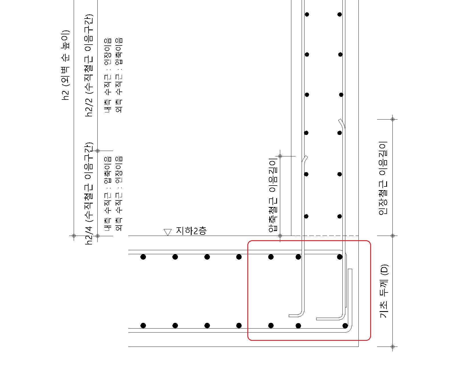 붉은색 박스로 표시된 부분을 보시면 온통기초의 상하부 철근에 갈고리를 만들어서 배치된 것을 볼 수 있습니다. 일반적으로 구조도면에서 갈고리에 대해 특별하게 표기를 하지 않으면 표준갈고리로 보고 배치하면 됩니다.