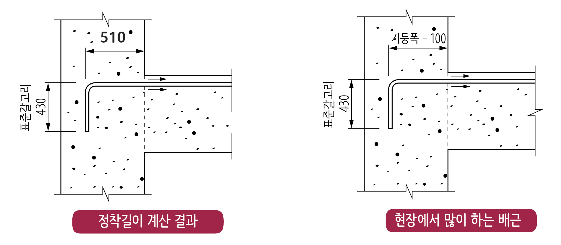 계산된 결과에 맞추어 배치하면 위 그림에서 왼쪽처럼 될 것입니다. 표준갈고리 부분과 정착길이를 모두 합하면 430 + 510 = 940입니다. 매립 부분의 전체 길이를 정착길이로 산정했을 때는 1,600이었으니까 정착되는 부분의 길이를 훨씬 줄일 수 있습니다. 그래서 현장에서 90˚표준갈고리를 만들어서 정착하는 방법을 가장 많이 사용합니다.