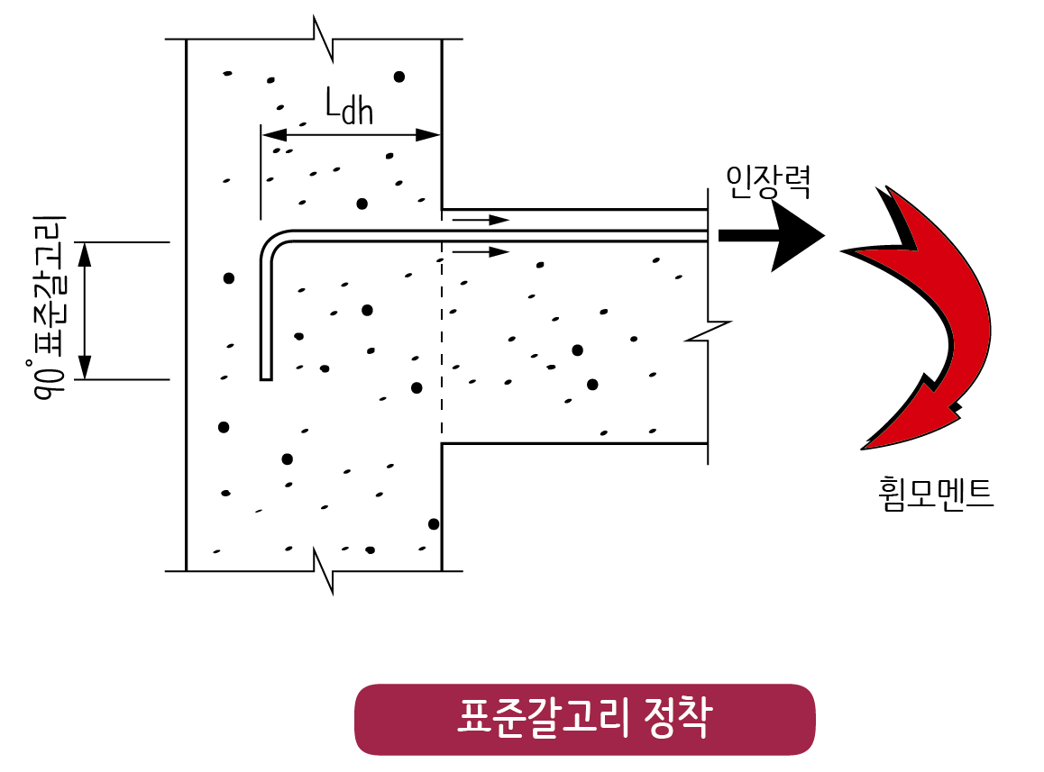 우선 기억해야 할 것은 표준갈고리를 갖는 인장 이형철근의 정착길이는 표준갈고리를 제외한 길이라는 것입니다. 다음 그림에서 Ldh라고 표기된 부분을 먼저 확인해주시기 바랍니다. L은 Length(길이)이고, d는 development(정착)이고, h는 hook(갈고리)를 나타냅니다.
