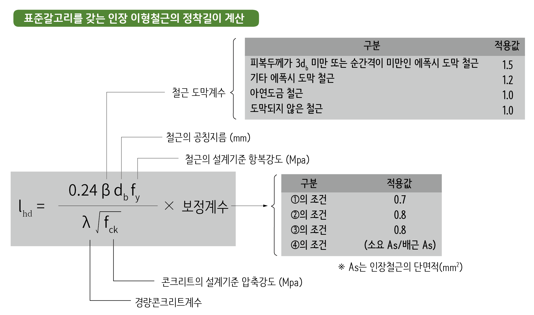 이 Ldh 값은 다음 식으로 계산하는데, 최소한 지름의 8배, 그리고 150mm 이상의 되어야 합니다.