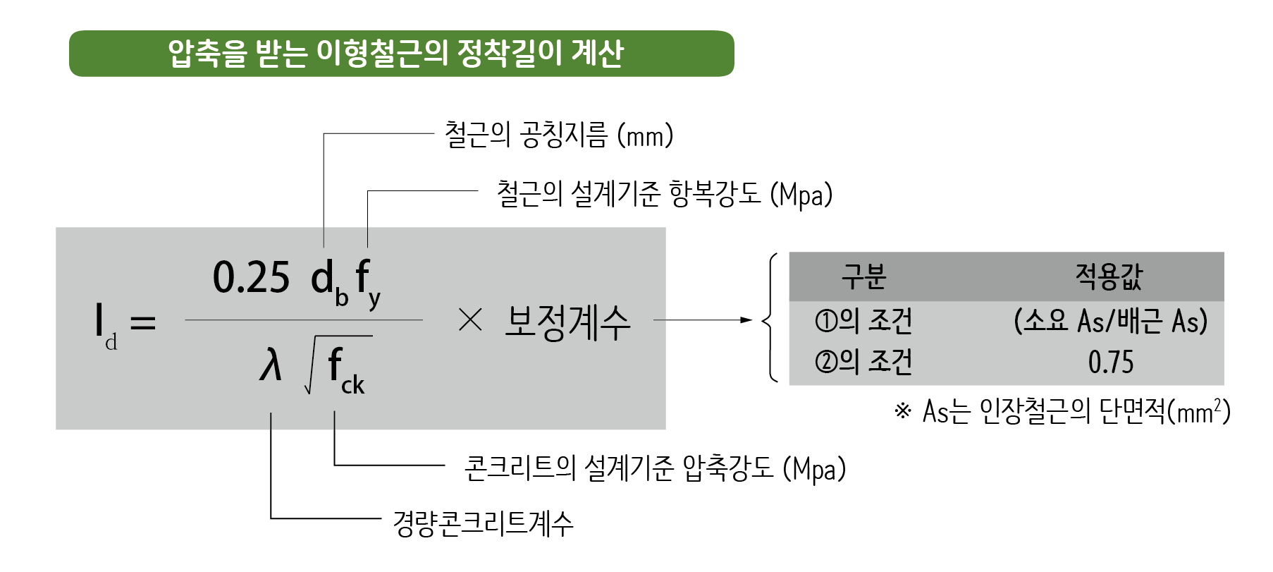 압축을 받는 이형철근의 정착길이는 다음과 같이 계산됩니다. 이 값은 항상 200mm 이상이 되어야 합니다.