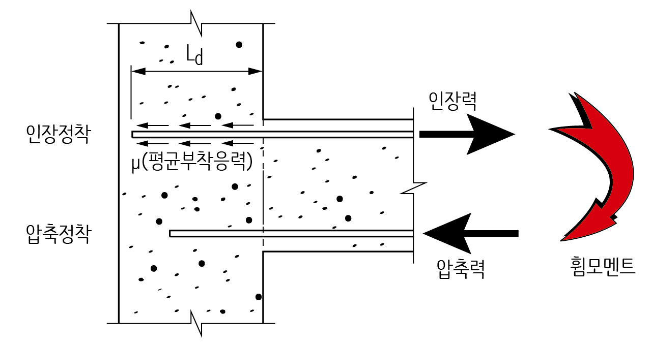 정착은 기둥 및 벽, 보, 슬래브 등 콘크리트 개별 부재에서 힘을 전달하고자 하는 부재로 철근을 묻어서 힘을 전달하는 것을 말합니다. 예를 들어 보의 경우 휨모멘트가 작용하면 기둥과 면한 보의 상부에는 인장력이 작용하고 하부에는 압축력이 작용합니다. 따라서 보에 작용하는 휨모멘트를 기둥에 전달하려면 상하부 주근이 기둥에 매립되어야 합니다. 콘크리트는 인장력에 약하기 때문에 인장력을 받는 상부근을 기둥에 충분히 묻어야 기둥으로 힘을 전달할 수 있습니다.