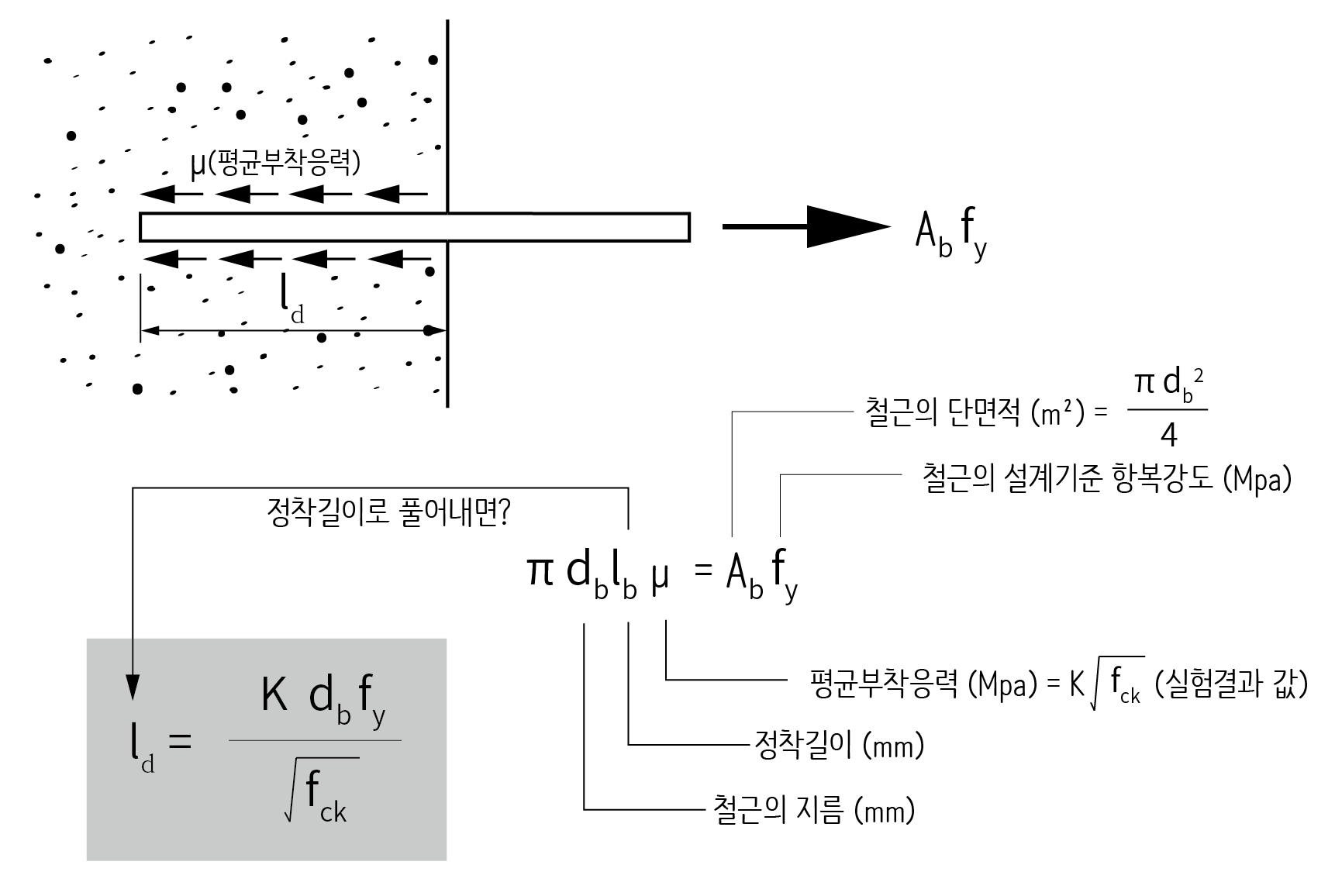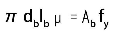 정착길이는 항복강도에 이를 때까지 뽑히지 않아야 하기 때문에 철근을 뽑아내려는 최대의 힘은 철근의 단면적에 설계기준 항복강도를 곱해서 계산할 수 있습니다. 따라서 인장 정착길이는 단면적 Ab인 철근에 외력 Ab × fy가 작용하여 파괴에 도달했을 때, 극한 부착응력을 고려한 내력(π × db × ld × μ)이 평행상태를 이루는 조건으로 풀어냅니다.