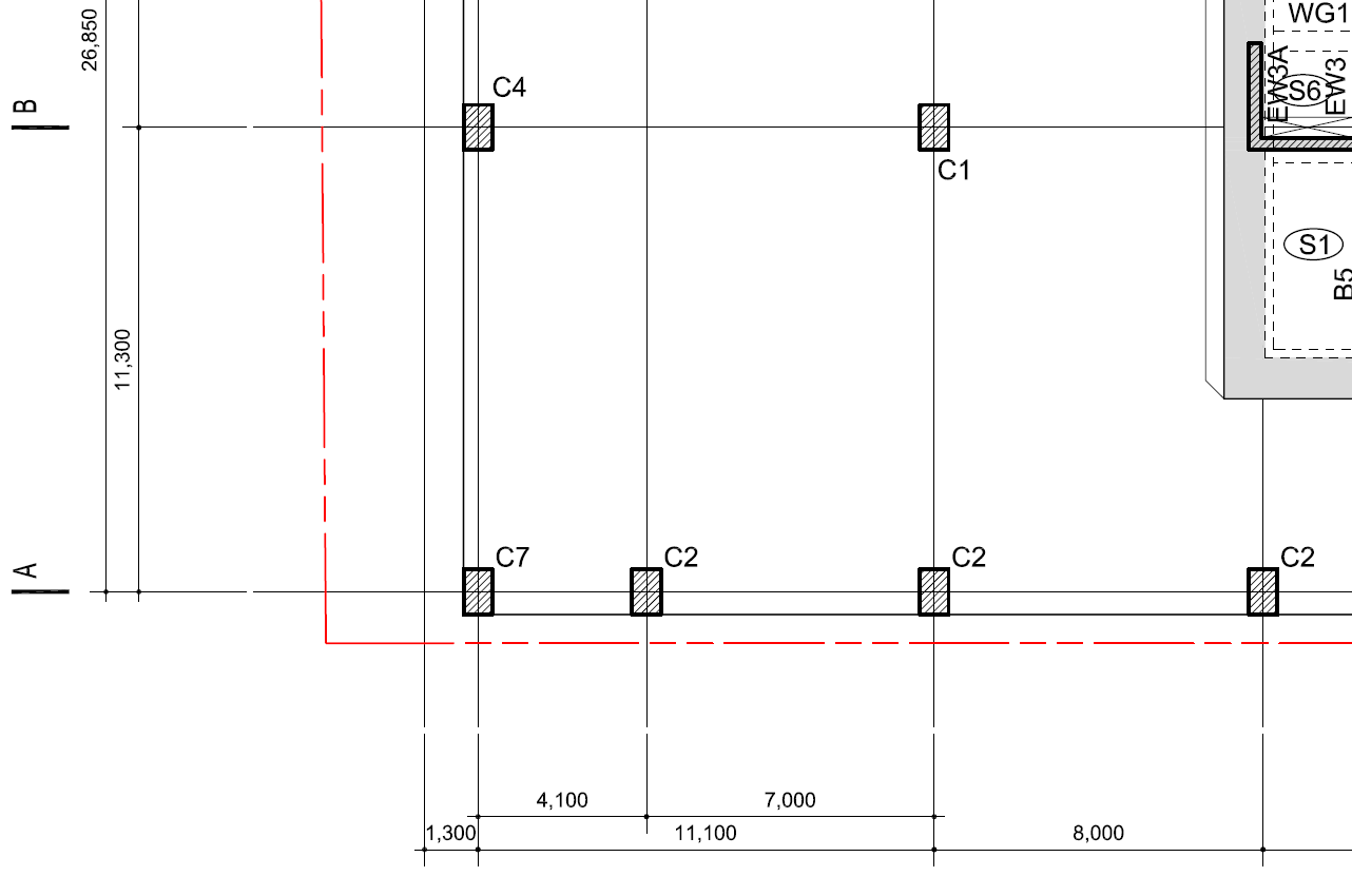 평면도의 축적에 비해 기둥 철근의 크기가 상대적으로 작아서 평면도에 표시하는 것은 불가능합니다. 따라서 평면도 상에는 각 기둥의 위치와 형상을 표기한 후 식별 기호를 기둥 옆에 표기합니다. 기둥의 식별기호는 Column의 머리글자를 따서 C로 표기합니다. C 다음에는 기둥의 종류별로 식별 번호를 부여합니다.