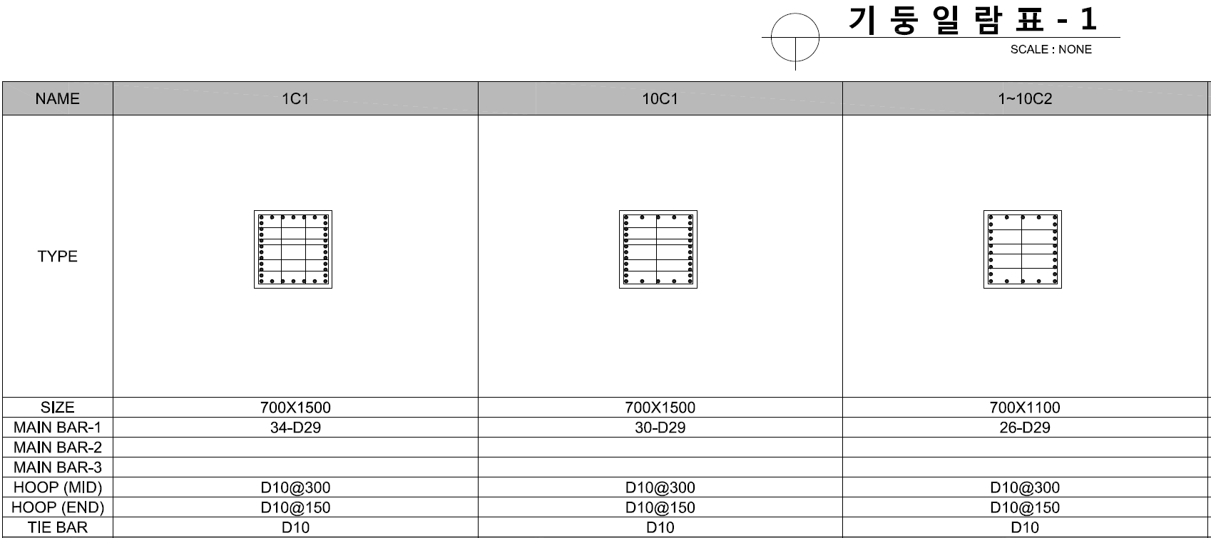 각각의 기둥의 상세 배근 정보를 확인하려면 도면 뒷쪽으로 가서 부재별 일람표를 확인해야 합니다. 부재 일람표에서 기둥의 형상뿐 아니라 배근에 필요한 철근 정보를 확인할 수 있습니다.
