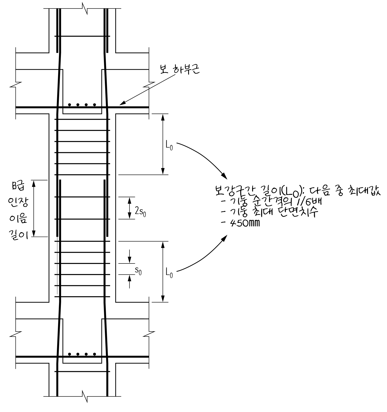 그림에서 볼 수 있는 것처럼 기둥은 기둥의 순간격과 최대단면치수를 고려해서 결정해야 합니다. 여기서 기둥 순간격은 기둥 아래에 있는 슬래브 윗면과, 기둥 위에 붙어 있는 보의 아랫면 사이의, 순수하게 기둥만 있는 부분을 말합니다.