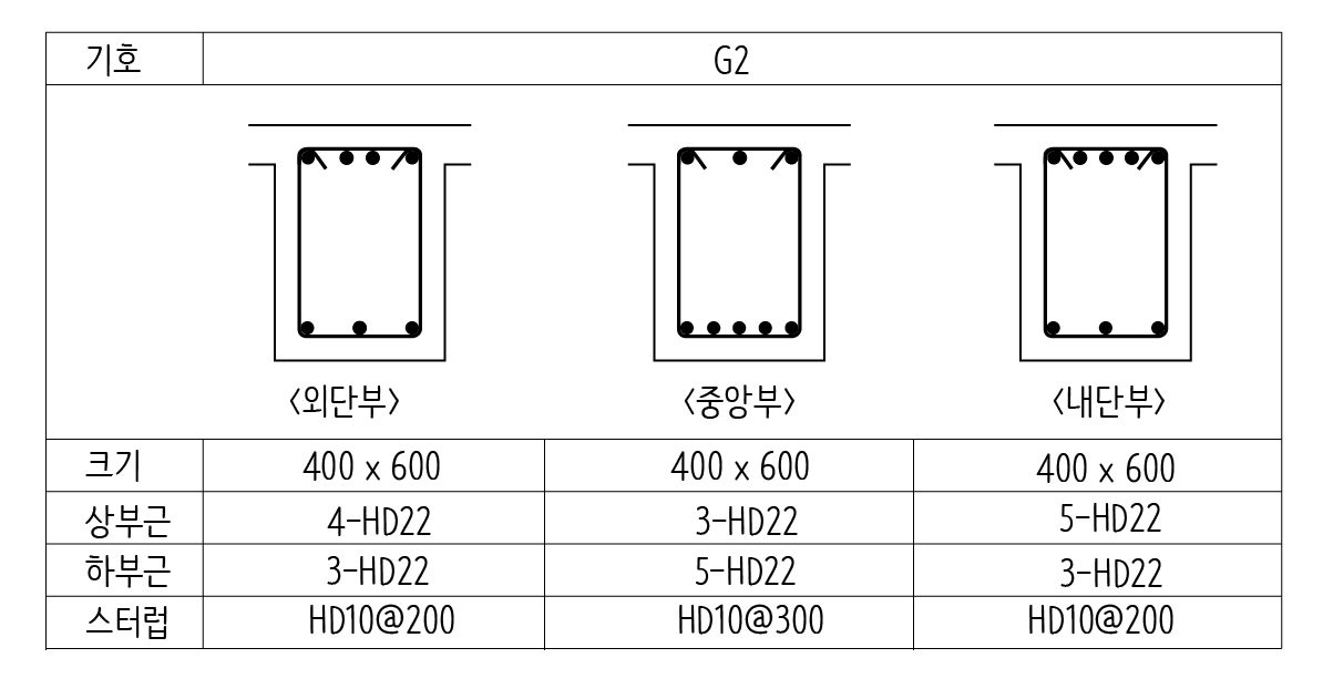 도면에 표기할 때는 외단부 및 중앙부, 내단부 각각의 단면을 잘라 배치해야 하는 철근의 지름과 개수를 표기합니다. 외단부와 내단부는 위로 구부러지는 휨모멘트때문에 윗쪽에 인장력이 발생하므로 상부 철근량이 많아집니다. 중앙부는 아래쪽이 늘어나기 때문에 하부 철근량이 많아집니다. 이것을 구조도면에 보 일람표로 표현하면 다음과 같이 됩니다. 기호 G는 큰보(Girder)를 의미합니다. 작은보는 B(Beam)로 표기하겠죠.