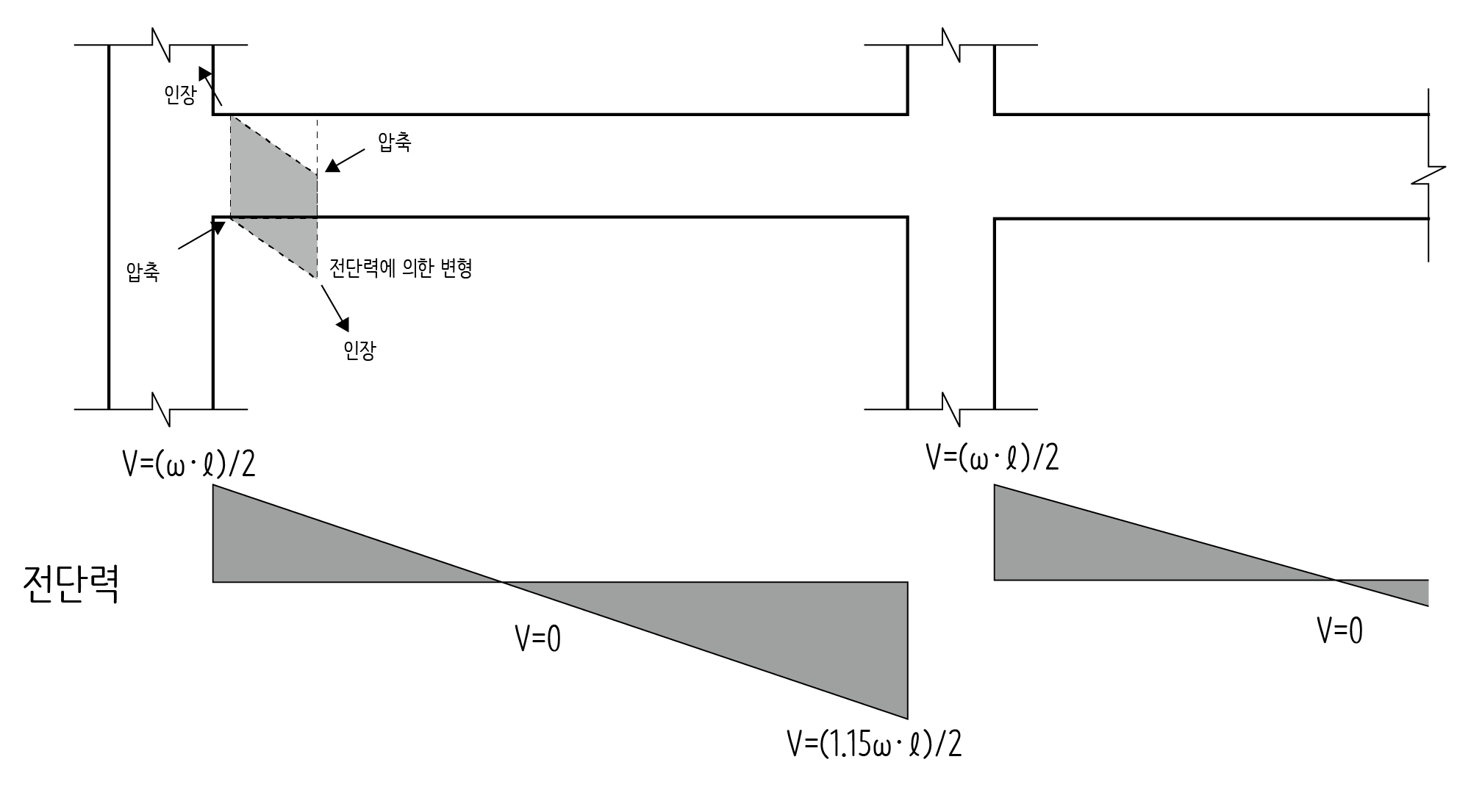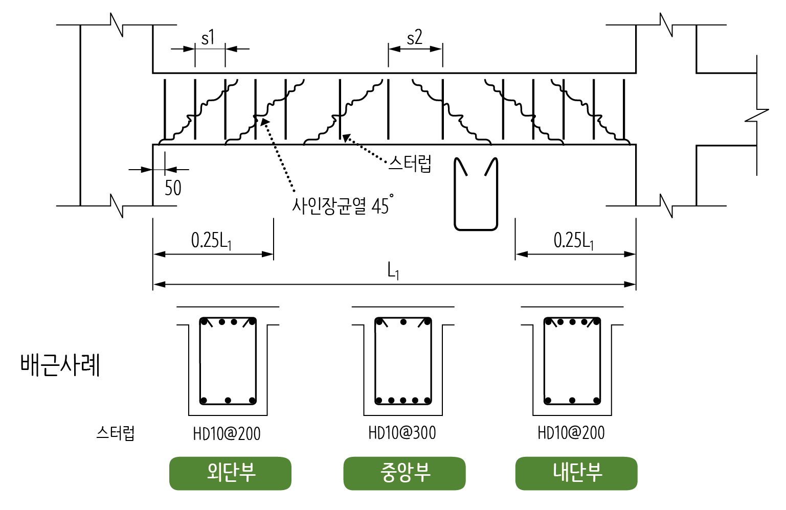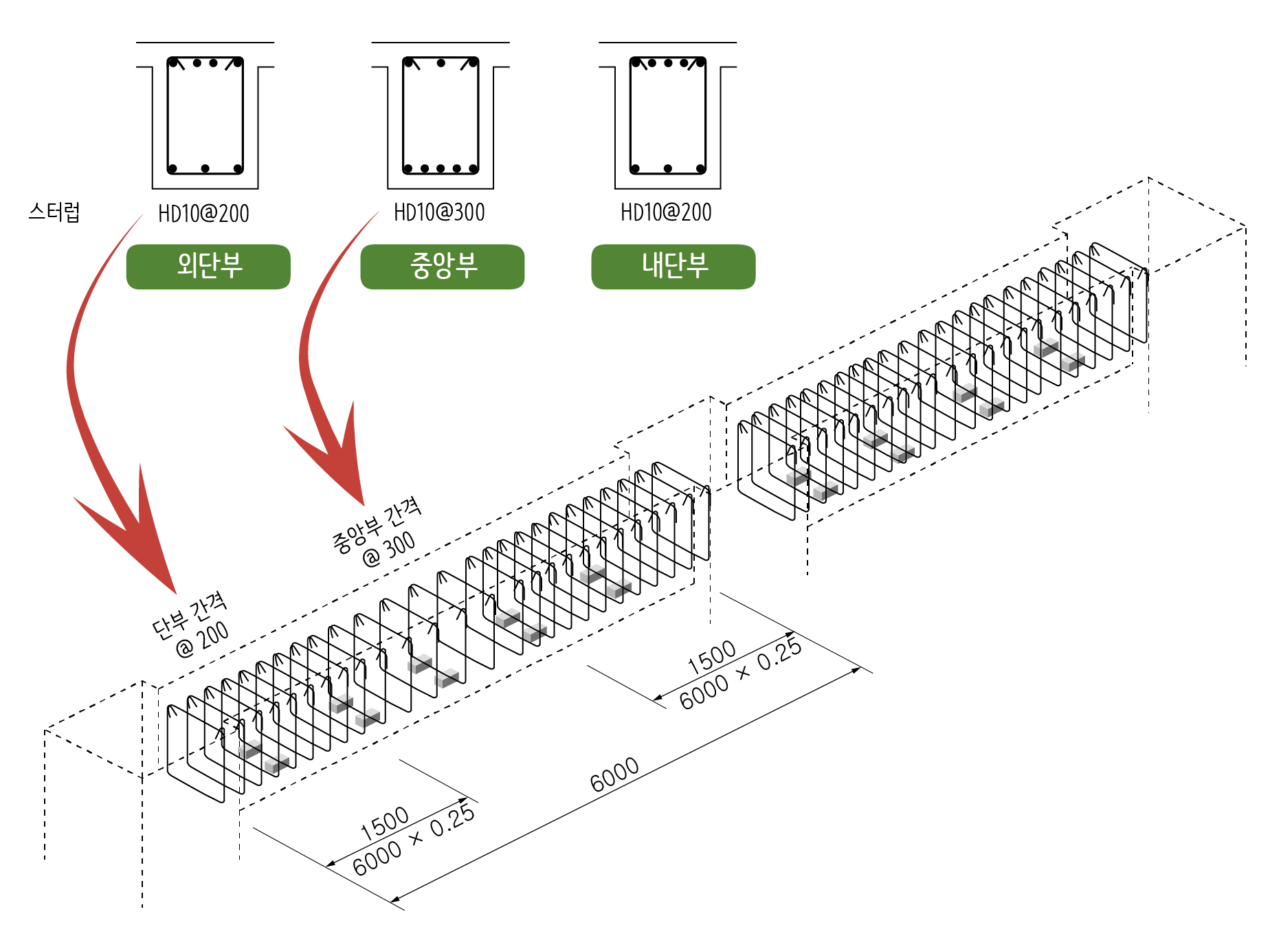 보에서 발생하는 전단응력은 기둥과 인접한 위치에서 가장 크고 안쪽으로 갈수록 줄어들어 중앙부에서 최소가 됩니다. 따라서 단부에서 스터럽의 배근간격이 촘촘해지고 중앙부에서 넓게 배치됩니다.