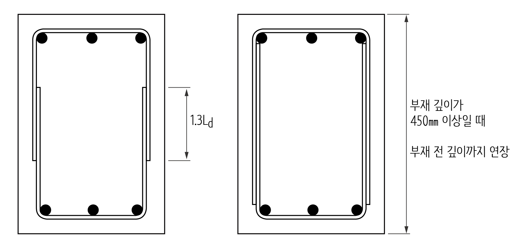 콘크리트 구조설계기준에서는 받침부에서 응력의 반전 또는 비틀림을 받는 휨 골조부재의 횡철근은 휨보강철근 주위까지 연장시킨 폐쇄스터럽으로 하도록 규정하고 있습니다.
