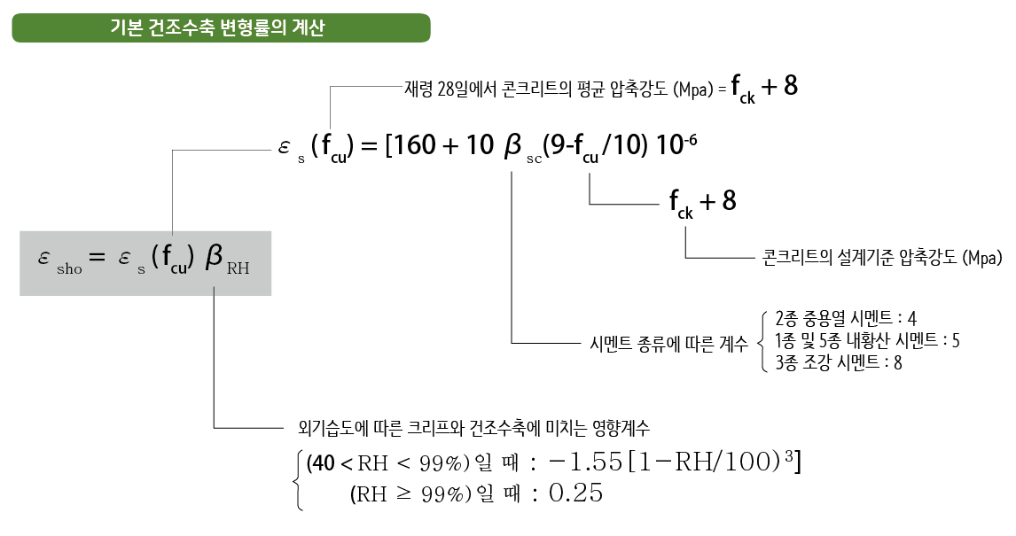 구조설계기준에서는 콘크리트의 기본 건조수축 변형률을 다음과 같이 제시하고 있다.