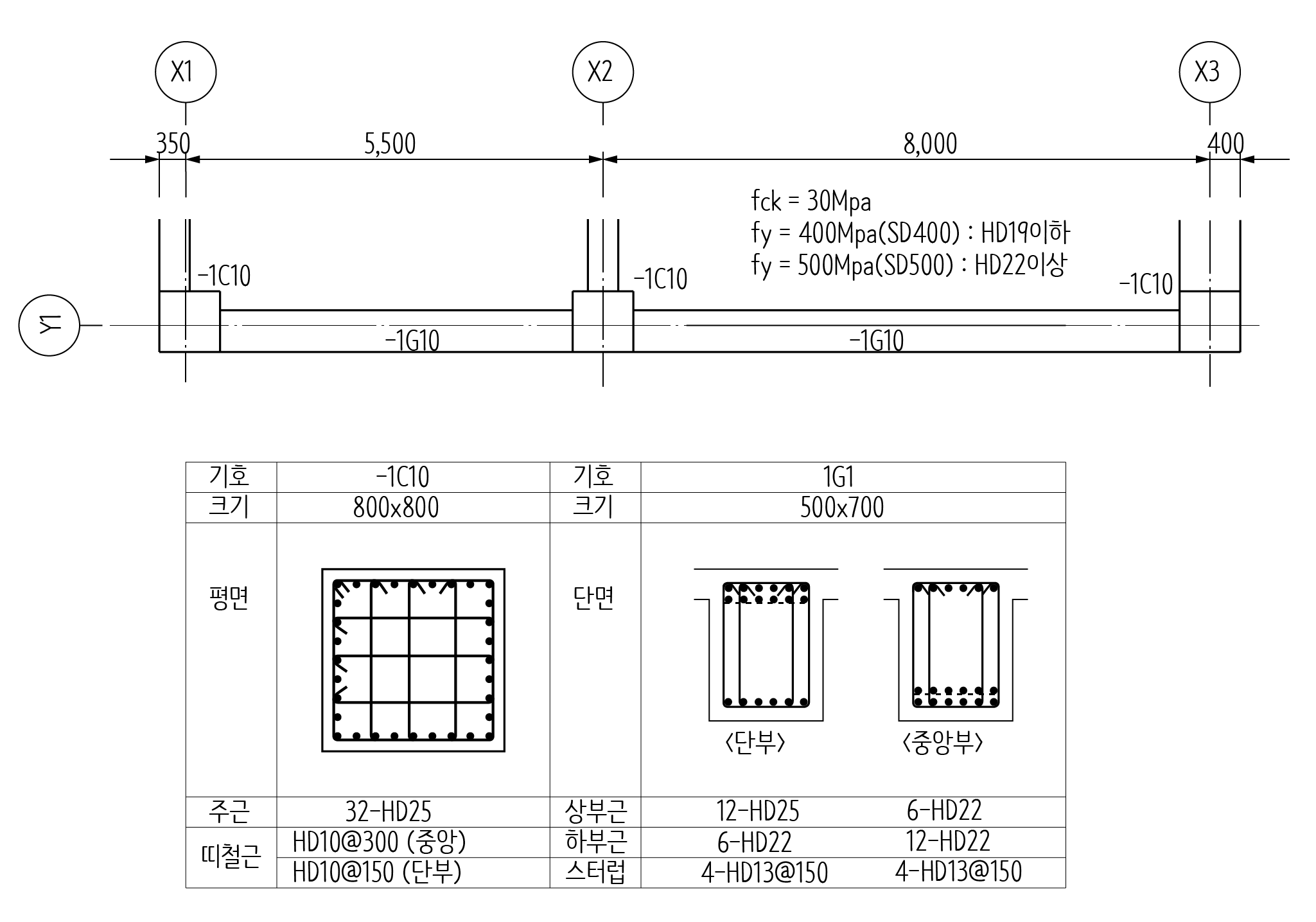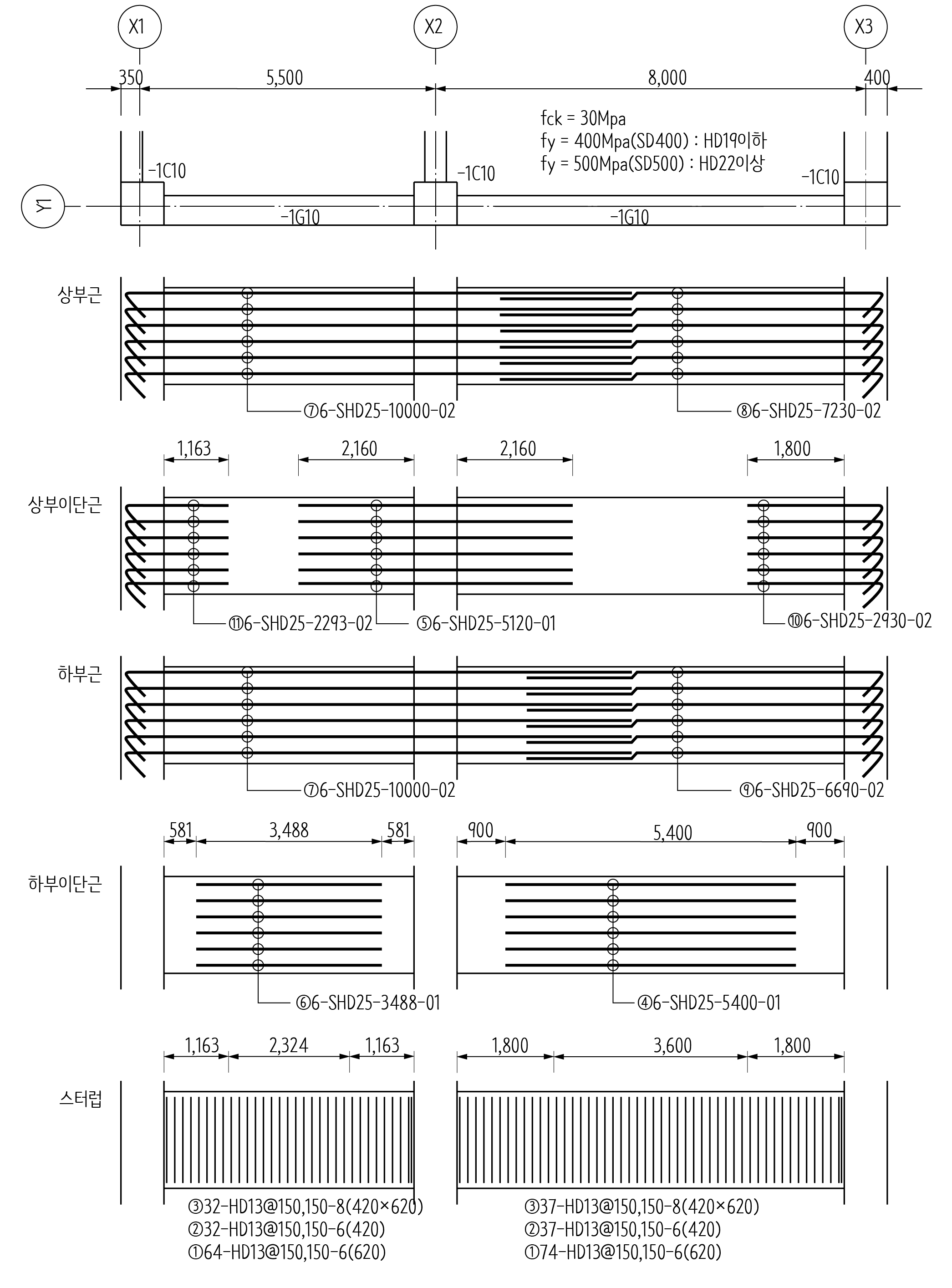 그럼 다음과 같은 구조도면에 보 철근상세도를 어떻게 그리는지 살펴보겠습니다.