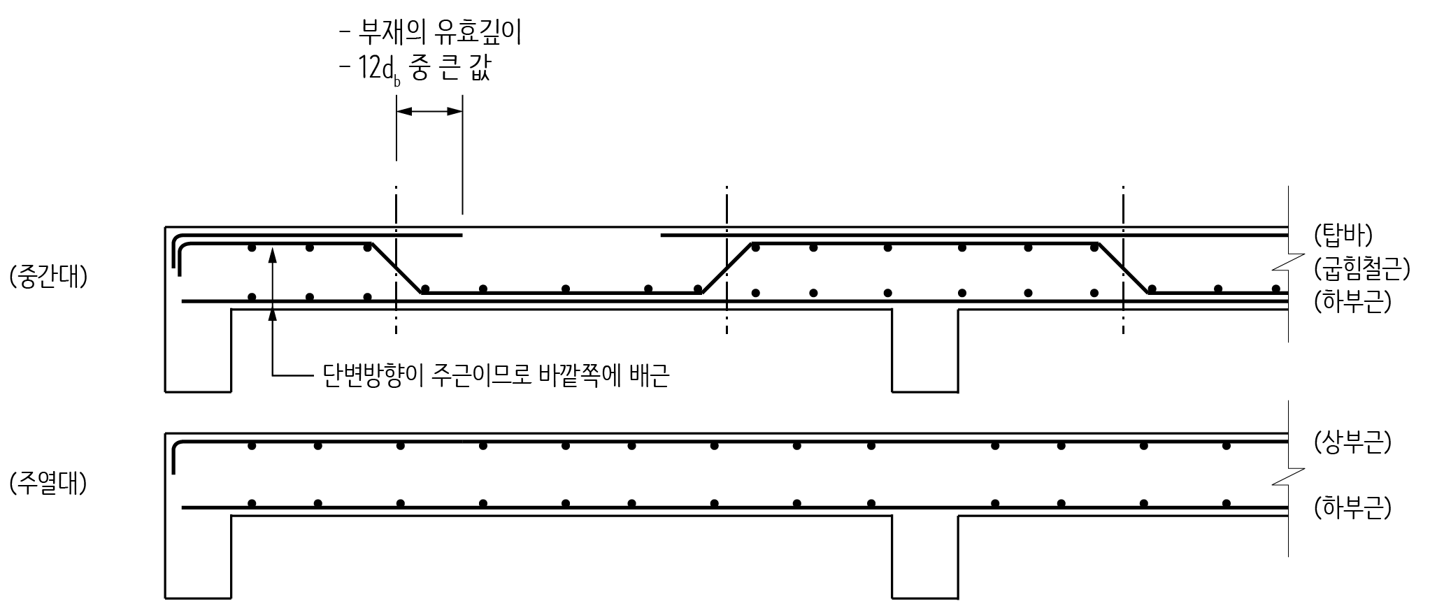 탑바는 주열대와 중간대를 나누는 기준선을 지나 더 내밀어서 정착을 해야 합니다. 이때 슬래브의 유효깊와 12db를 비교해서 큰 값만큼 내밀어서 정착해야 합니다. D10 철근을 사용한다면