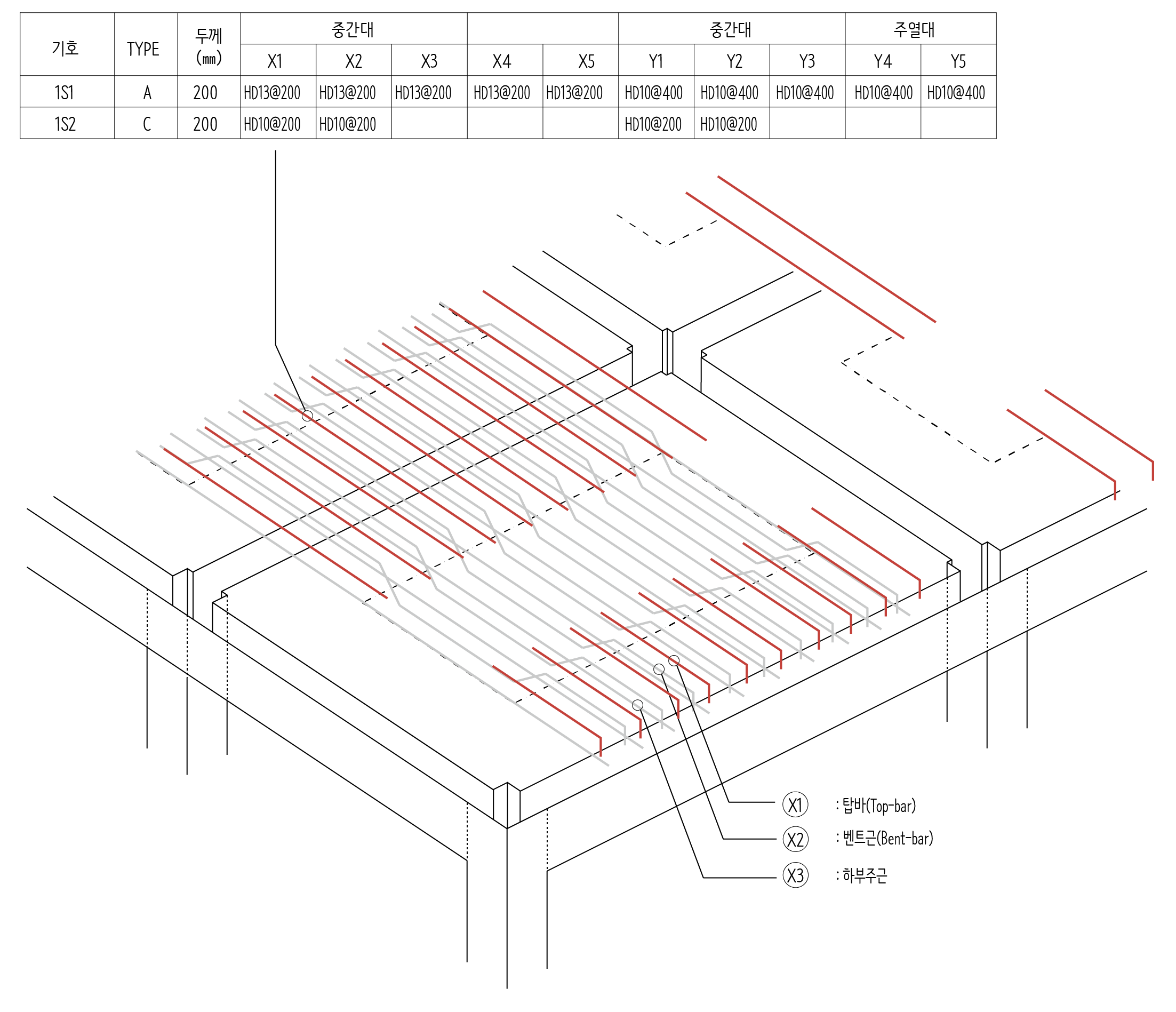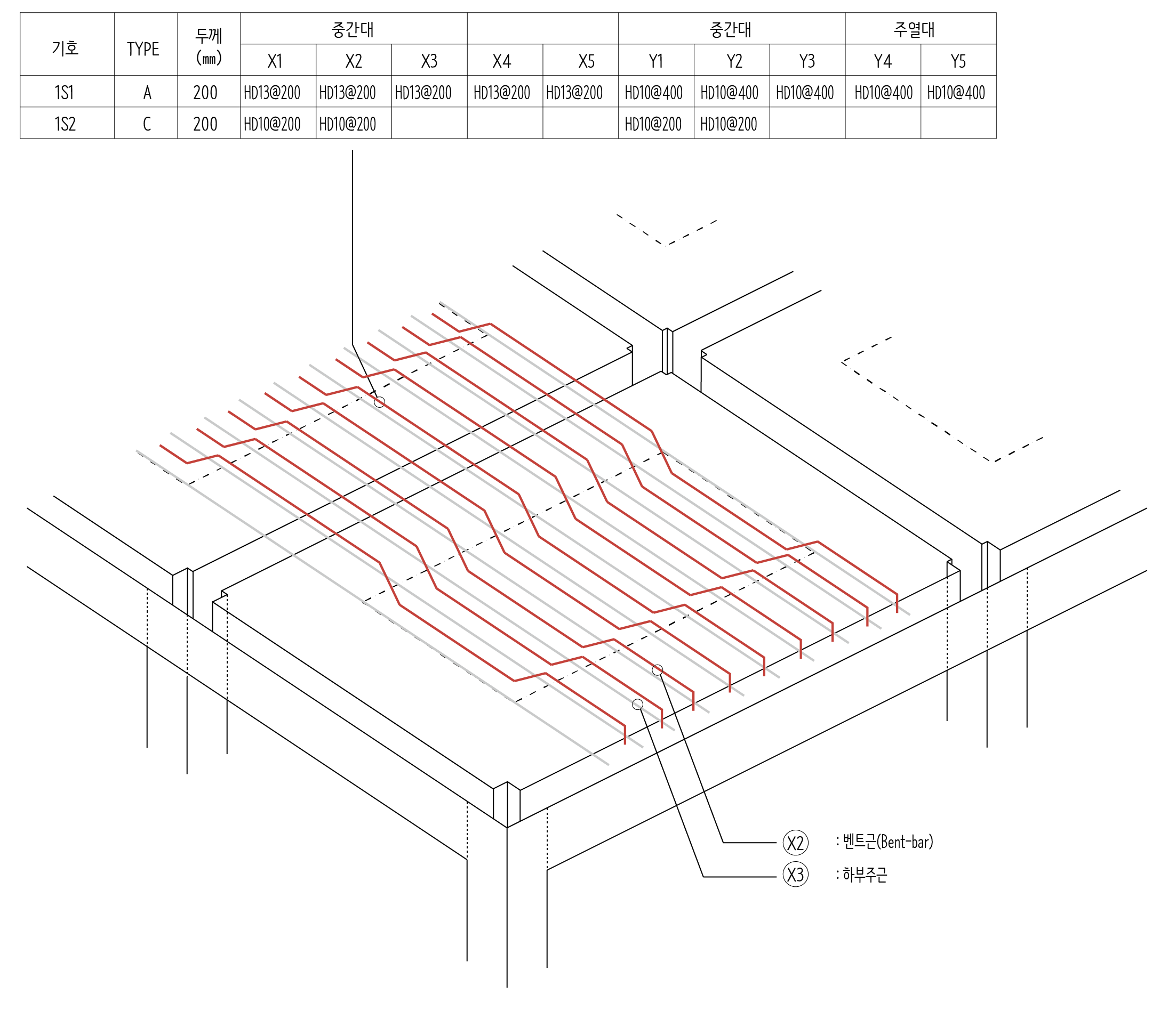 이렇게 배치하고 보면 단변방향 중간대를 가로지르는 철근들의 실제 간격은 200이 아니라 100이 됩니다. 중간대 지점에서 보면 하부 주근(X3) 사이에 굽힘철근(X2)가 놓이기 때문에 각각의 간격 200을 1/2로 나눈 100 만큼 철근이 배치된 것으로 볼 수 있습니다.