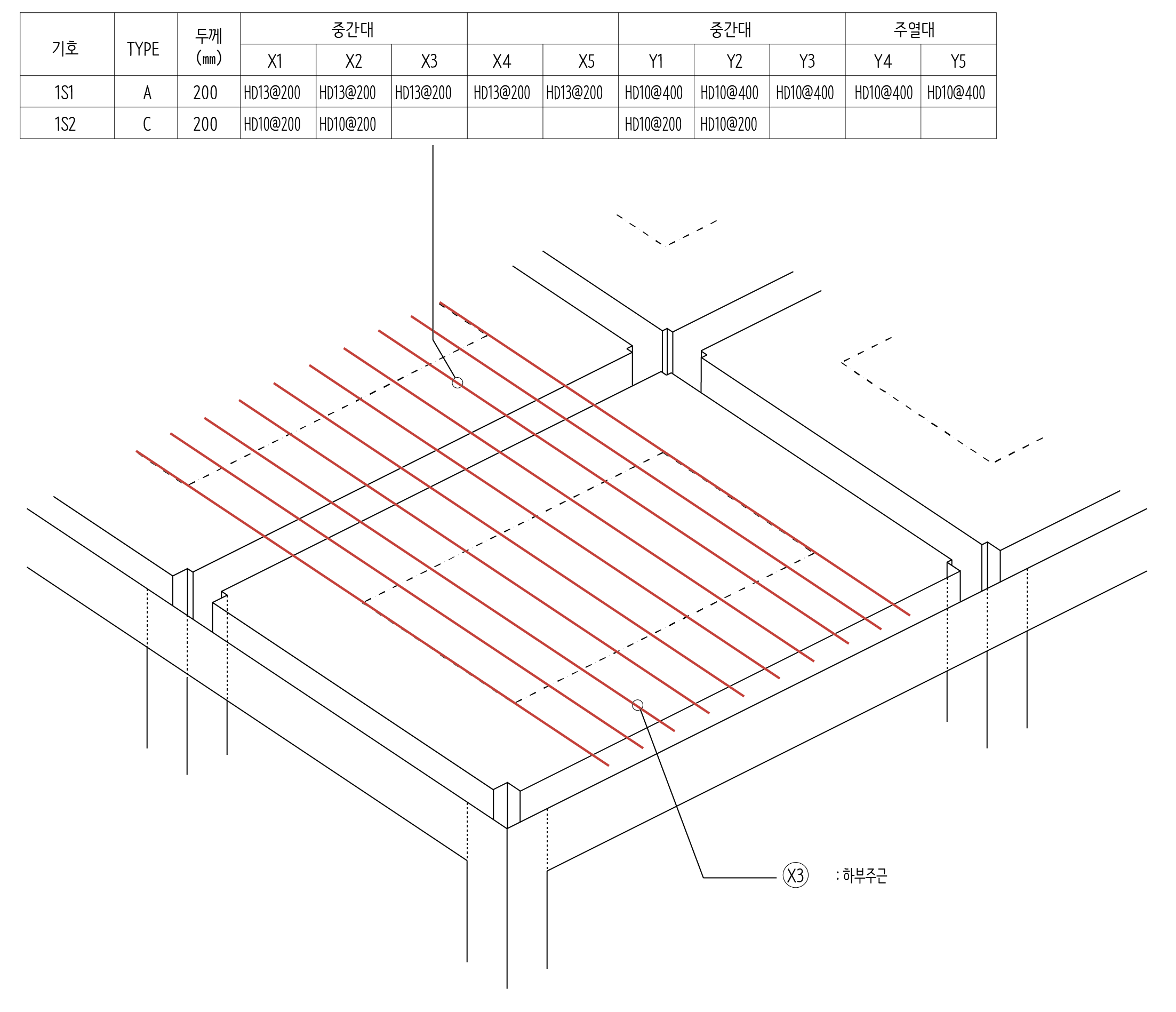 슬래브는 단변방향으로 힘이 많이 전달되기 때문에 단변방향 철근이 주근이 되고, 제일 먼저 배치합니다. 그리고 중간대 지나는 하부근(X3)가 가장 중요한 역할을 합니다.