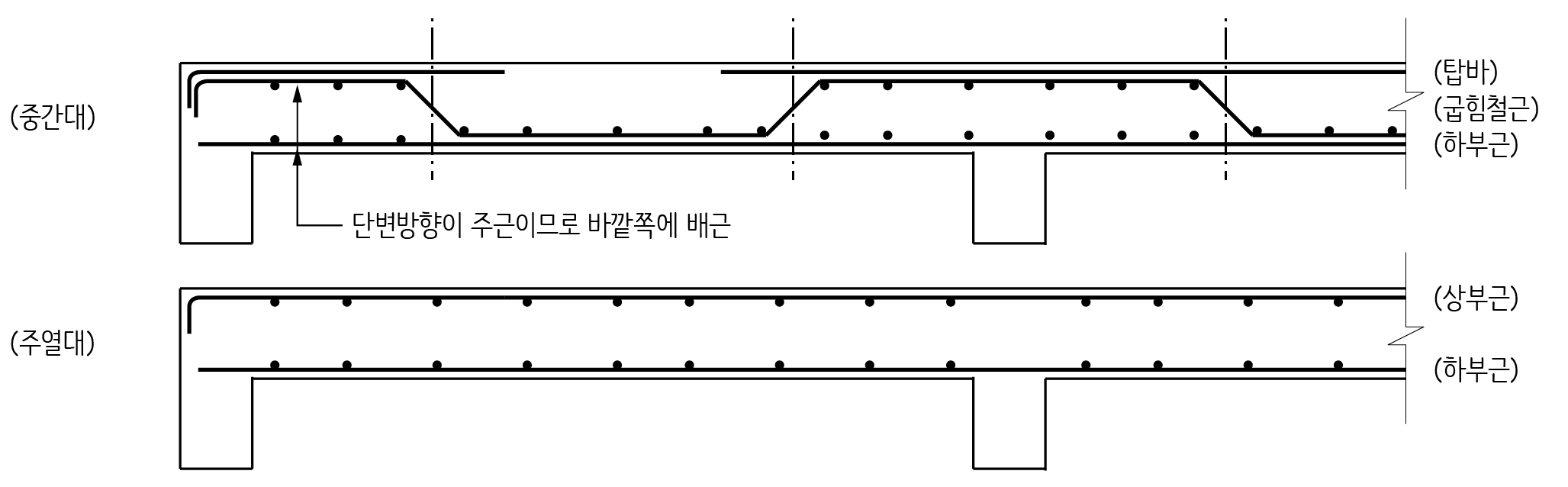 중간대 구간을 지날 때는 하부근으로, 주열대 구간을 지날 때는 상부근 역할을 합니다. 따라서 보에 정착할 때는 보에 인장정착이 되어야 합니다.