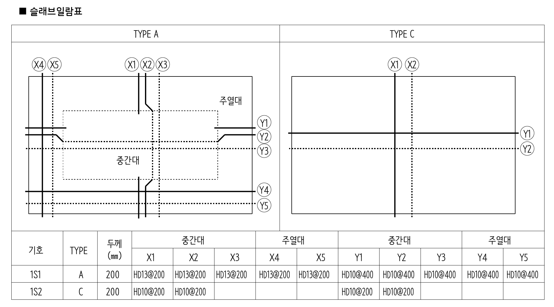 대표적인 배근 유형을 제시한 후 철근 유형별로 번호를 붙여서 상세 내용을 표로 제시합니다. 보통 단변방향을 X, 장변방향을 Y로 표시합니다. 가장 일반적인 유형 A(TYPE A)을 보면 단변방향으로 가로지르는 철근(X)을 보면 중간대을 가로지르는 철근이 세 종류(X1, X2, X3), 주열대 구간을 지나는 철근이 두 종류(X4, X5)가 제시됩니다.