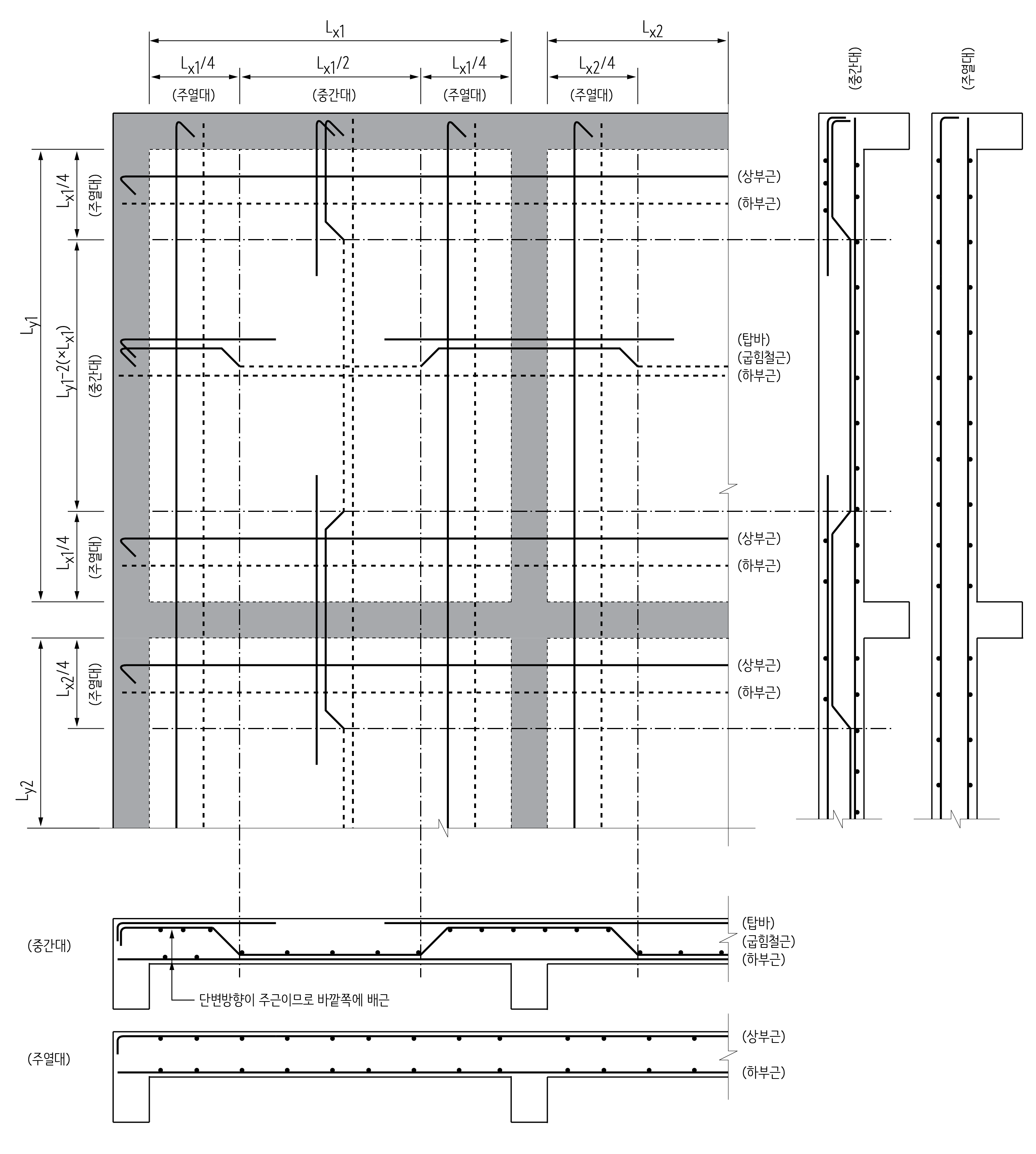 1방향 슬래브의 경우에는 Lx/2를 많이 적용합니다. 구조설계자에 따라 주열대와 중간대를 구분하는 영역을 다르게 해석하는 경우가 있습니다. 그래서 Lx/2를 많이 적용하는데, Lx/4를 적용하는 도면도 있기때문에 꼭 일반주기사항을 확인해야 합니다.