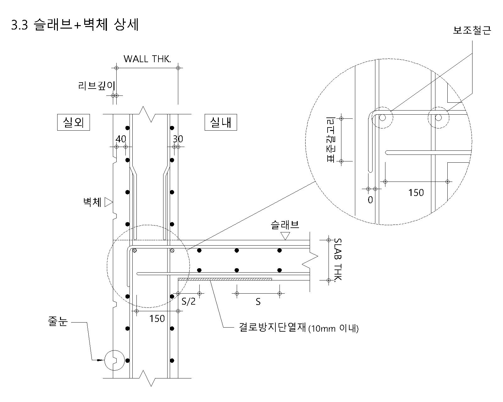 따라서 D10 철근을 사용한다면 슬래브 두께가 150을 넘게 된다면 항상 슬래브의 유효깊이만큼 더 내밀어야만 합니다.