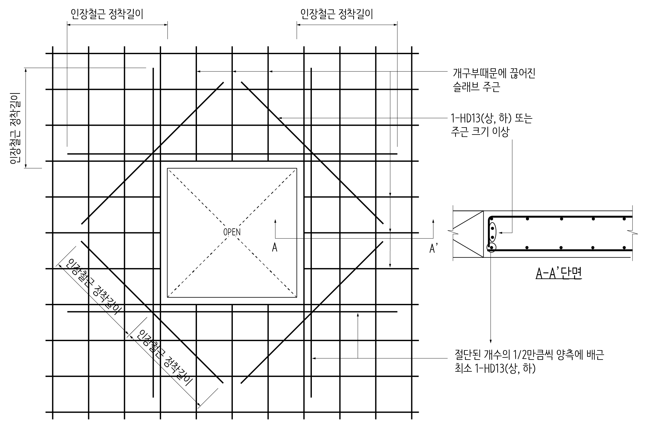 슬래브에서 개구부의 크기가 슬래브 판 크기에 비해 상대적으로 작은 경우에는 다음 그림과 같이 개구부에 의해 절단되는 철근과 같은 단면적의 철근을 개구부 양쪽에 보강하도록 규정하고 있습니다.