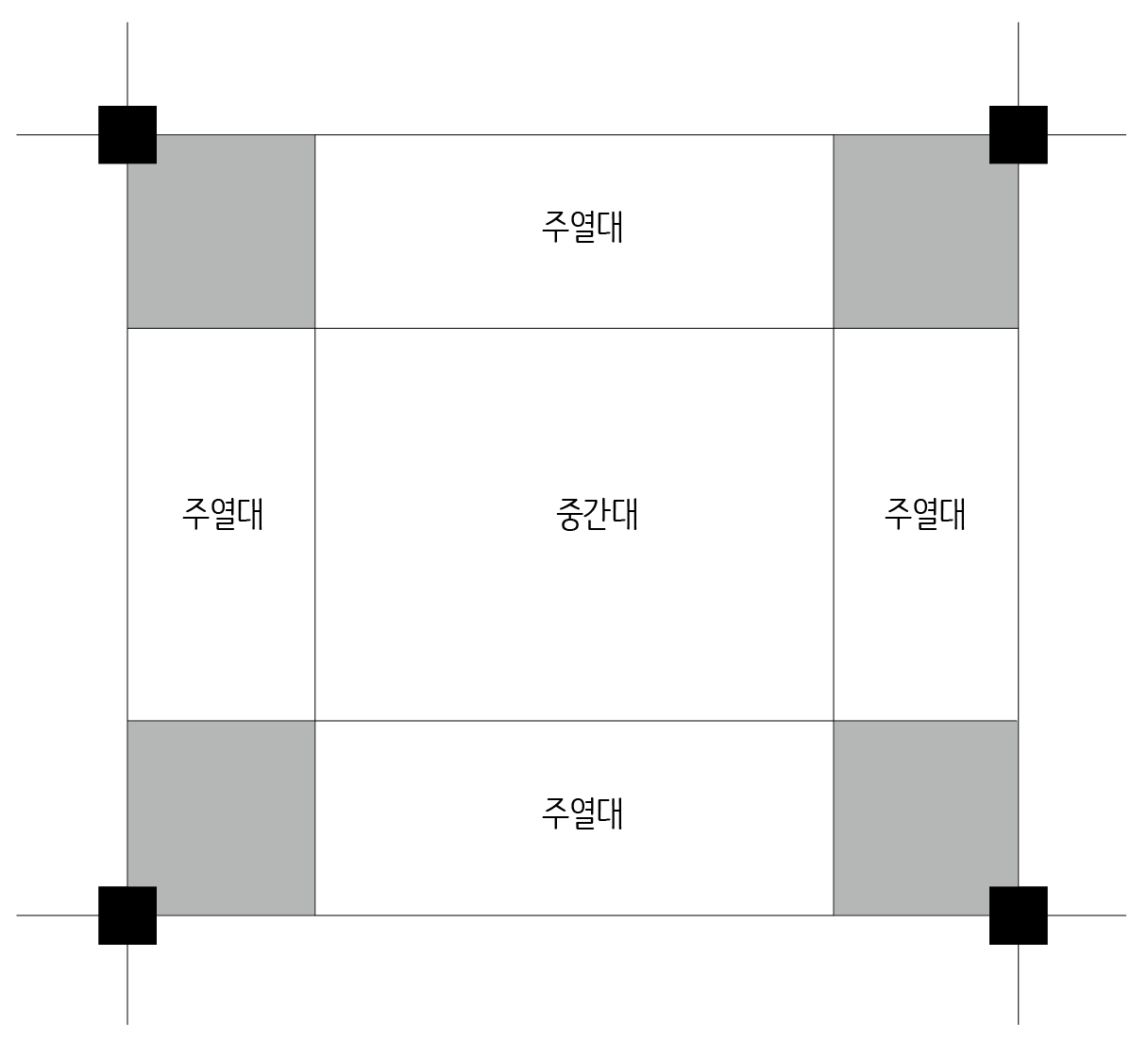 그런데 주열대에서는 주의해야 합니다. 양 방향의 주열대가 겹치는 부분(그림에서 회색으로 음영진 부분)에서는 어느 쪽의 경간에서나 주열대 폭의 1/8 이상의 폭을 가진 개구부를 두어서는 안 됩니다.