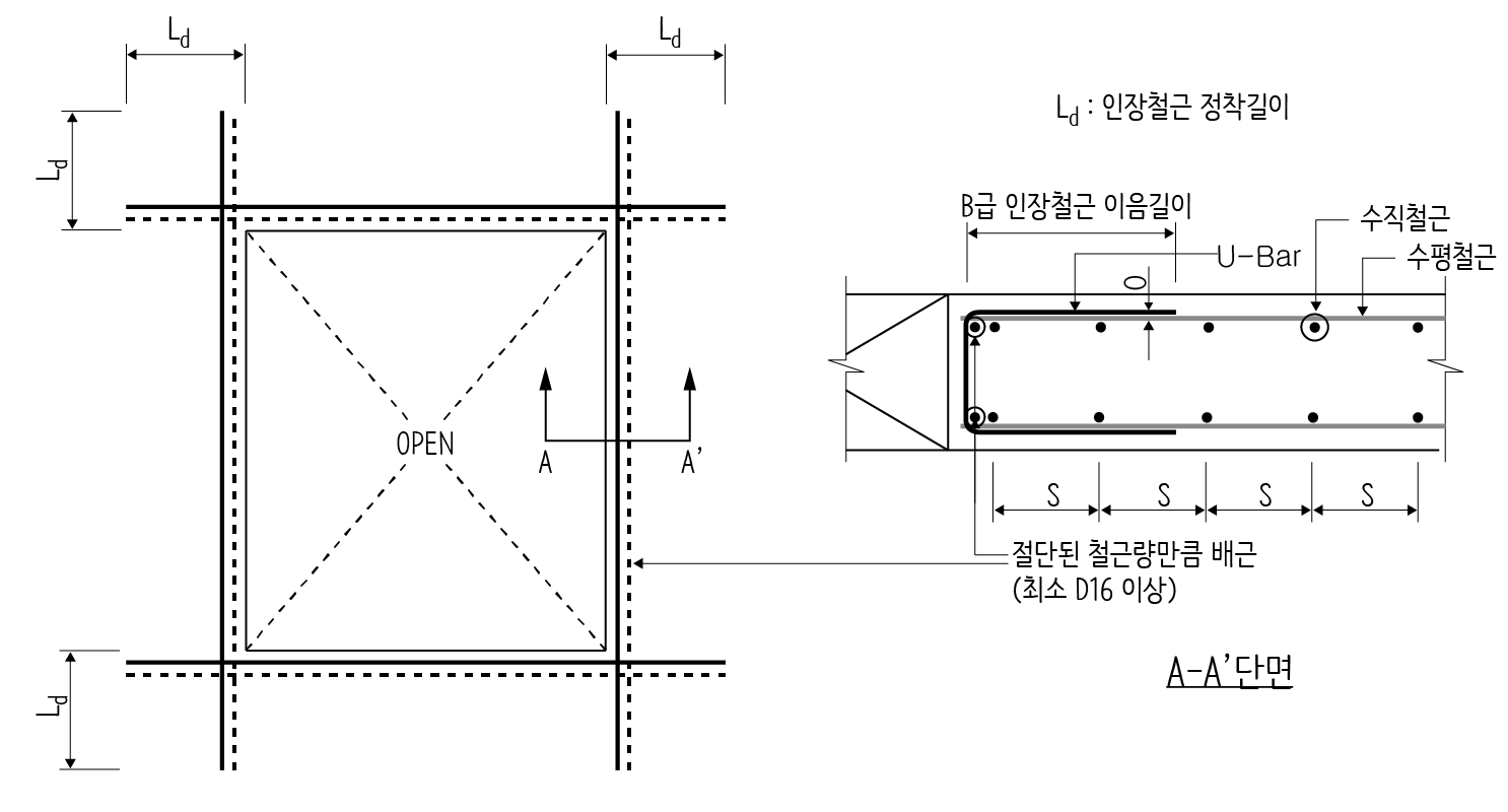 개구부 보강법은 기본적으로 개구부 때문에 절단된 철근만큼을 양측에 배근합니다. 이외에도 HD16 이상의 철근을 안쪽과 바깥쪽에 두 개 이상 배치해야 합니다. 이 철근은 개구부의 모서리에서 설계기준 항복강도를 발휘할 수 있도록 정착되어야 하는데, 통상 모서리에서 600mm 이상 연장하여 정착합니다.