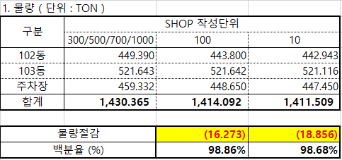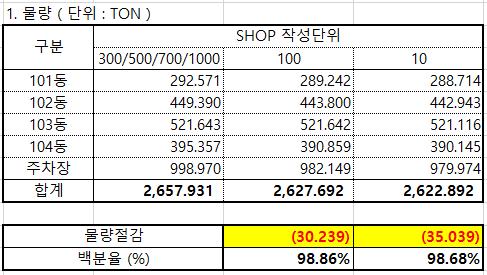아파트 2개 동과 주차장을 합한 결과를 보면 100mm 단위로 맞추었을 때 16톤 정도, 10mm 단위로 맞추었을 때가 18톤 정도 절감되는 것을 알 수 있습니다. 100단위로 맞추었을 때 절감되는 양이 크게 나타나지만 10단위로 맞추어도 절감량이 그렇게 크게 나타나지 않을 것을 볼 수 있습니다.
