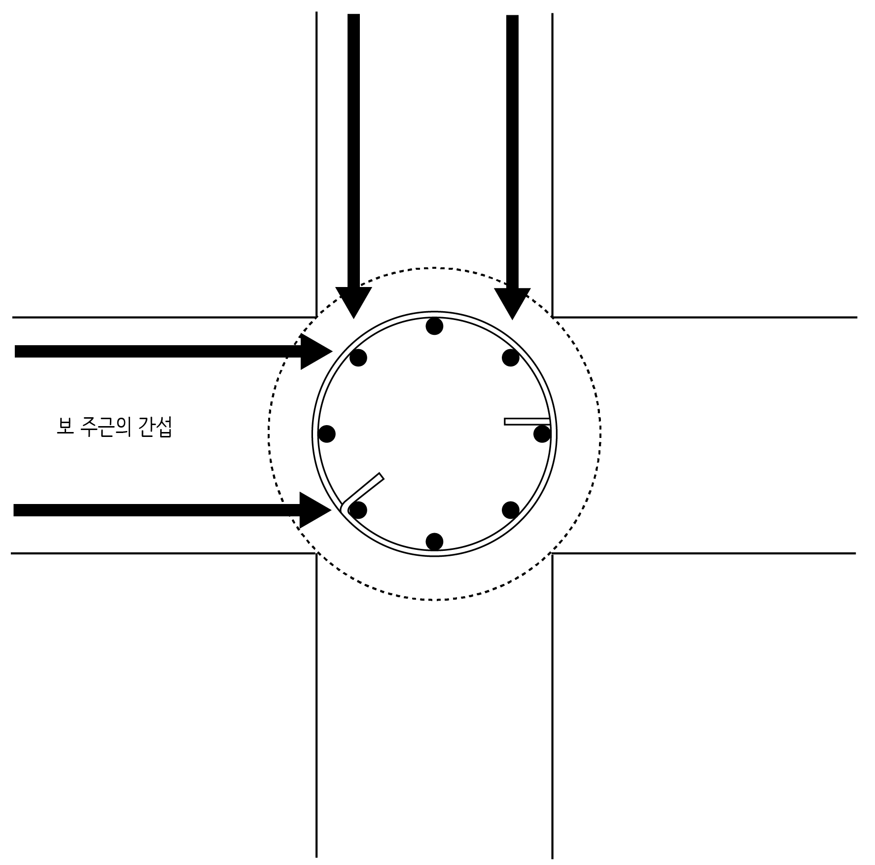 원형기둥에 보를 연결할 때는 원형기둥 중심에 맞추어 보의 위치를 맞추는 것이 합리적입니다. 원형기둥은 방향성이 없기 때문이기도 하지만 보 주근과의 간섭을 피하는 것도 유리합니다. 그런데 보의 크기는 원형기둥의 크기를 고려해서 결정해야 합니다. 아래 그림처럼 보가 연결되면 보 주근과 원형기둥의 주철근이 서로 간섭을 일으킬 수 있어서 배근하기가 쉽지 않게 됩니다.