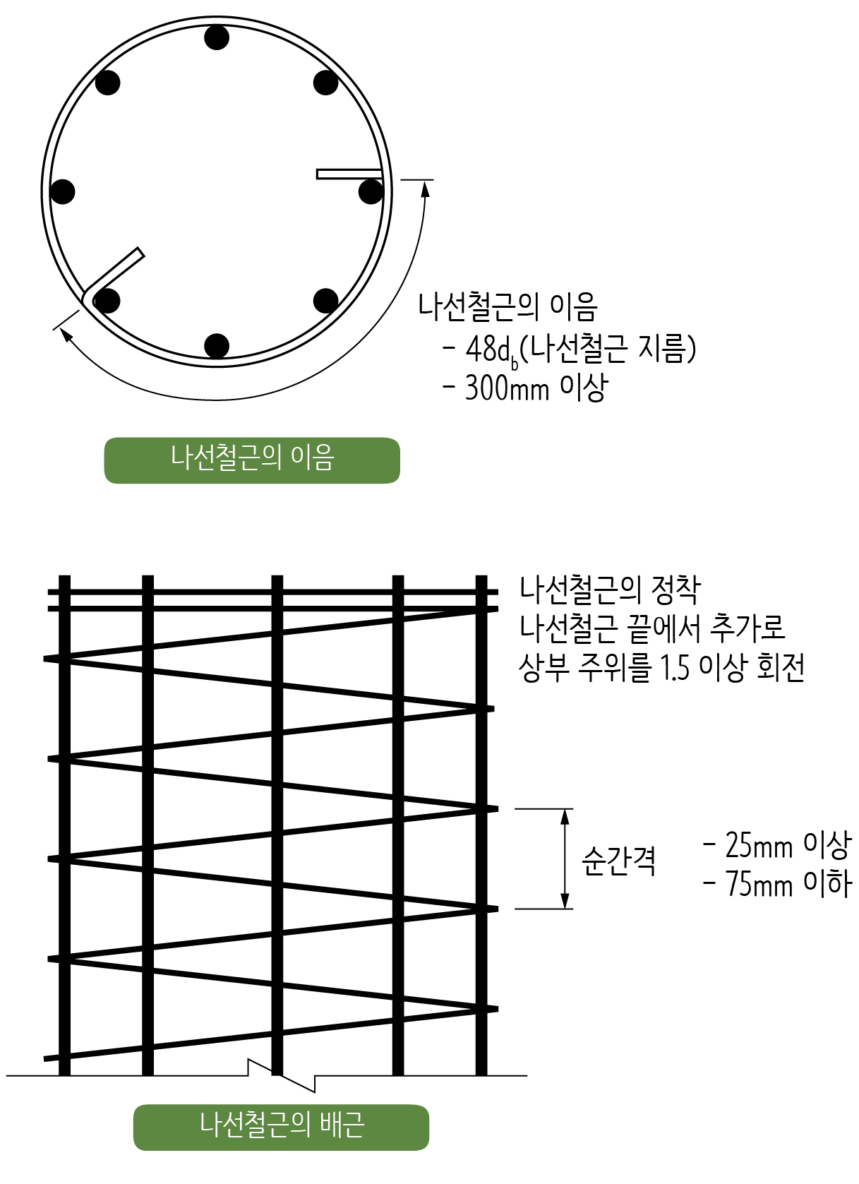 원형기둥과 나설철근의 배근 기준을 살펴보겠습니다.
