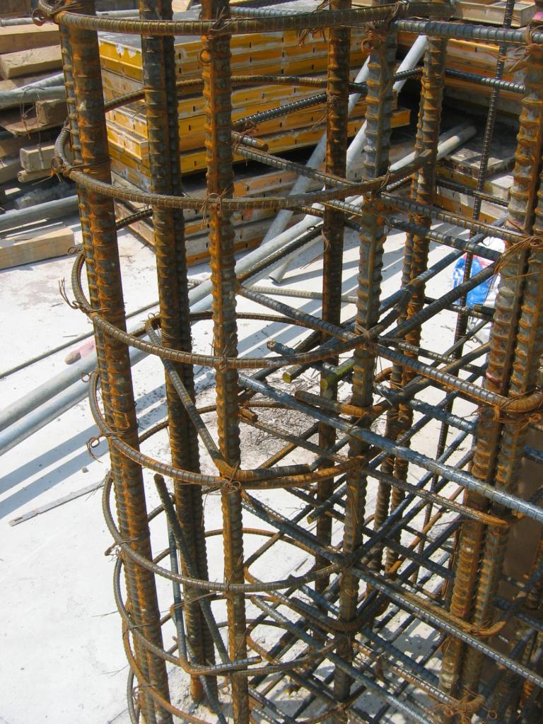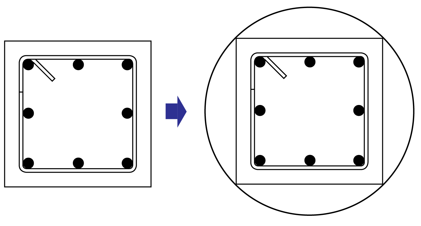 이렇게 하면 아래층 모서리 주근을 이어서 배근할 수 있기 때문에 철근을 배근하기가 수월해집니다. 그런데 이렇게 외접원의 형태로 원형기둥을 만들면 콘크리트량이 증가하는 단점이 있습니다.
