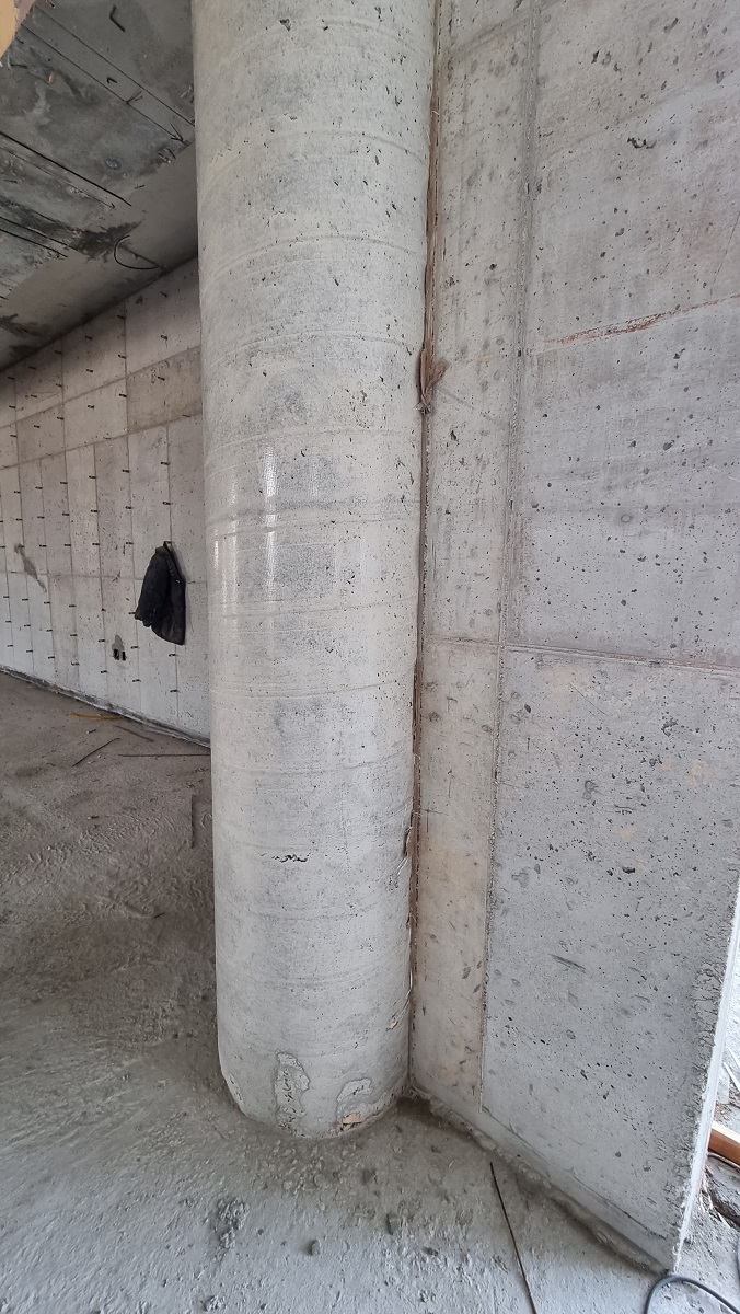 원형기둥은 철근 배근을 고려해서 크기를 결정할 필요가 있습니다. 대부분 장방형 기둥으로 구성된 건물에서 일정한 층만 원형기둥으로 처리한다면 장방형 기둥을 외접원으로 하는 원형기둥을 만드는 것이 합리적입니다.