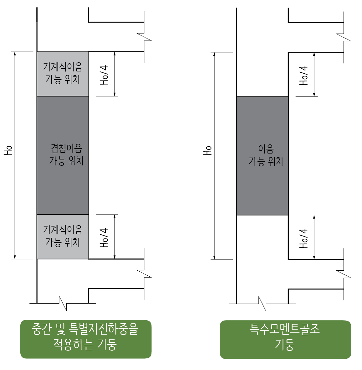 (1) 보와 기둥의 소성힌지구간에서는 겹침이음과 용접이음이 허용되지 않는다.