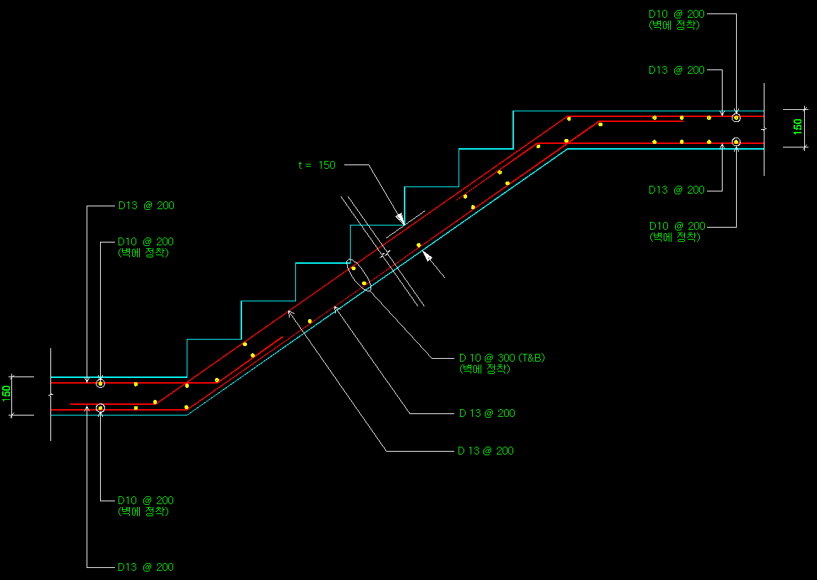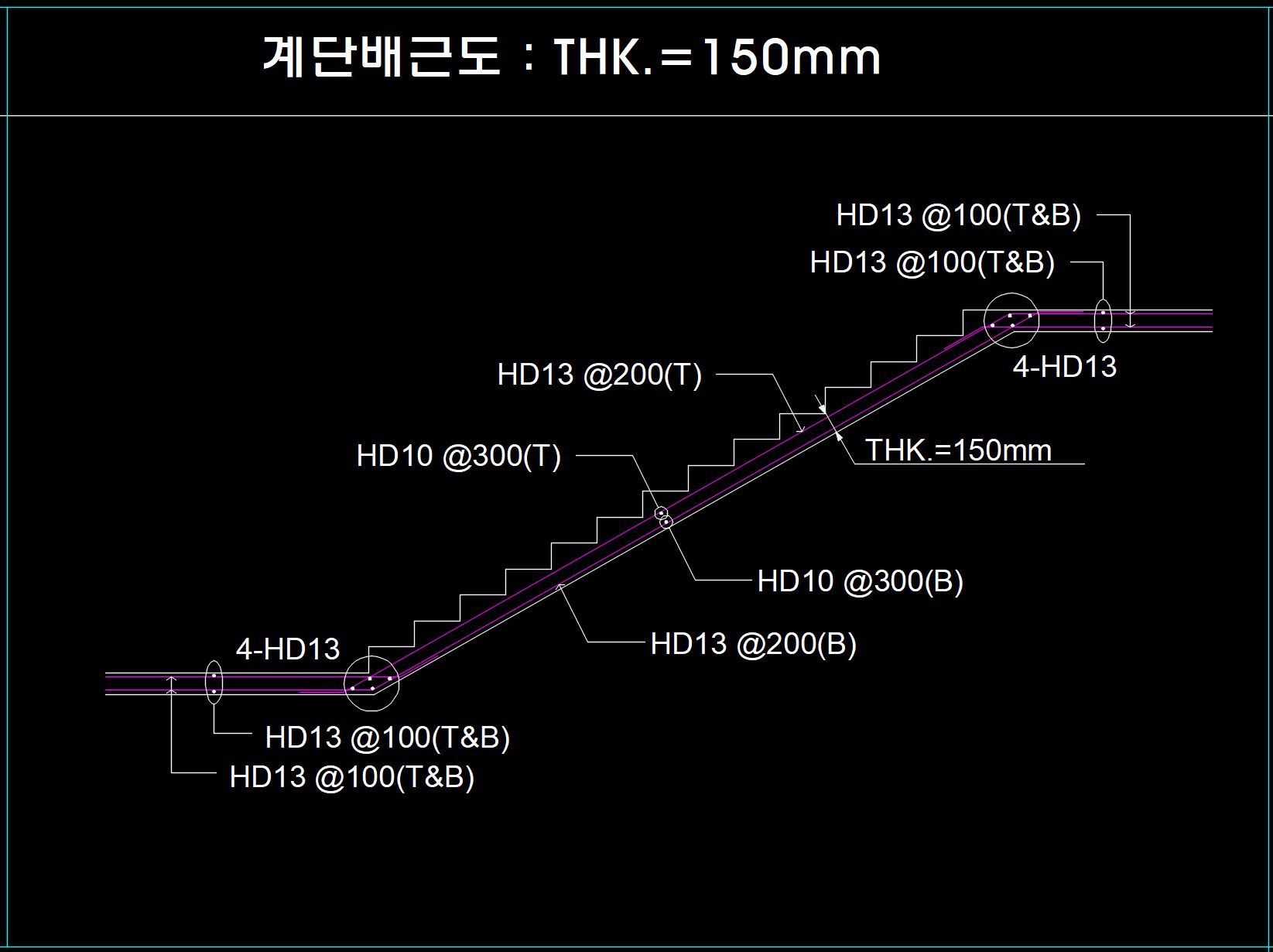 그리고 구조도면에 제시된 계단배근도 사례를 보면 다음과 같습니다. 인장력을 받는 주근이 D13으로 철근량이 많은 것을 알 수 있습니다.
