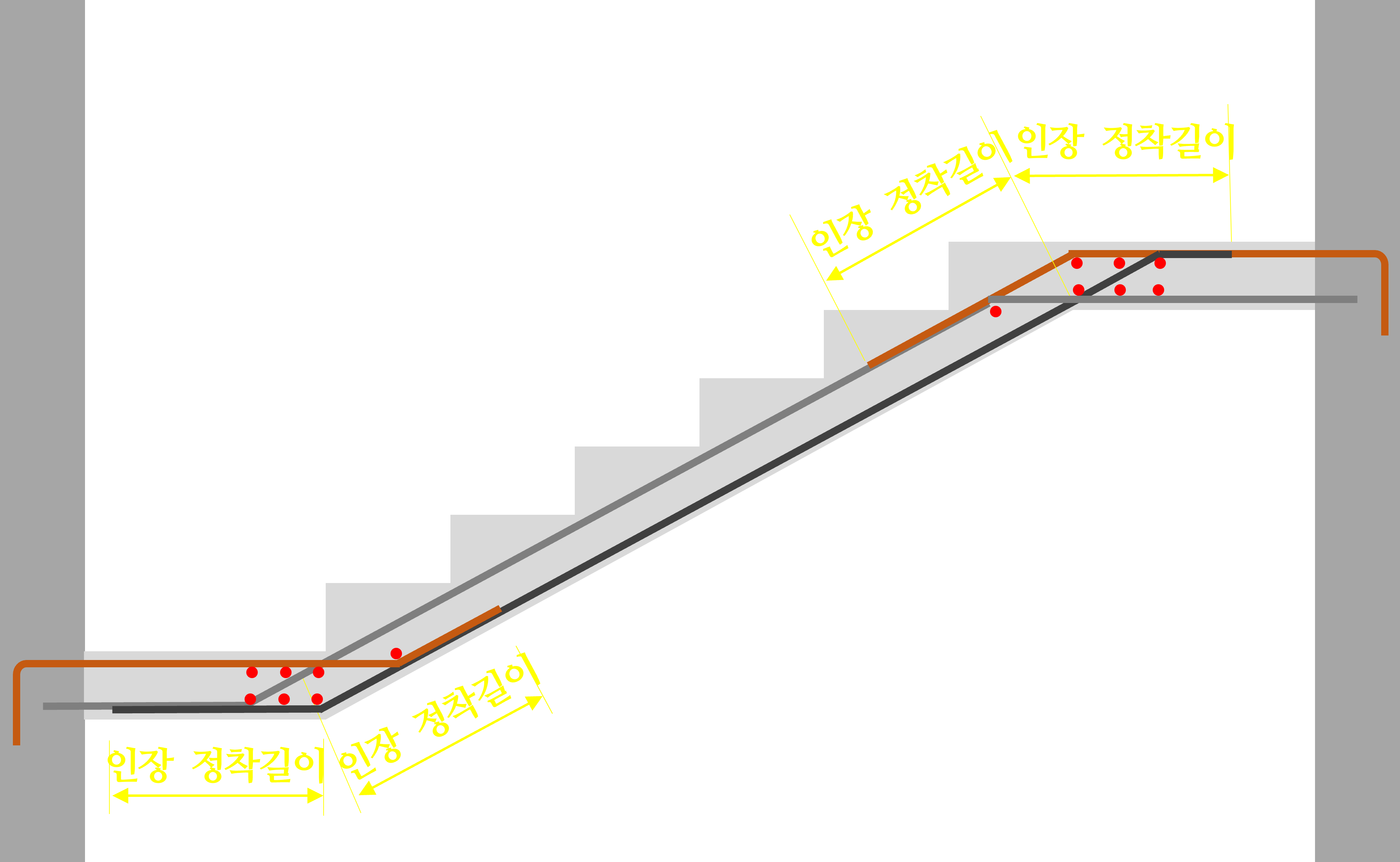 그래서 이 주근을 정착하는 방식과 나머지 철근들을 나타내면 다음과 같이 나타낼 수 있습니다.