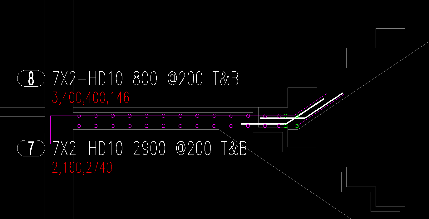 그런데 구조도면에서는 계단참이 꺾이는 부분에 철근의 복원력이 발생하지 않도록 다이아몬드 형상으로 구부려서 배치하라고 되어 있습니다. 그래서 이 철근을 따로 넣어주는 식으로 표기를 했는데, 도면에 하얀색으로 그려지 것이 그 다이아몬드 형상을 만들려고 별도로 넣는 철근입니다.