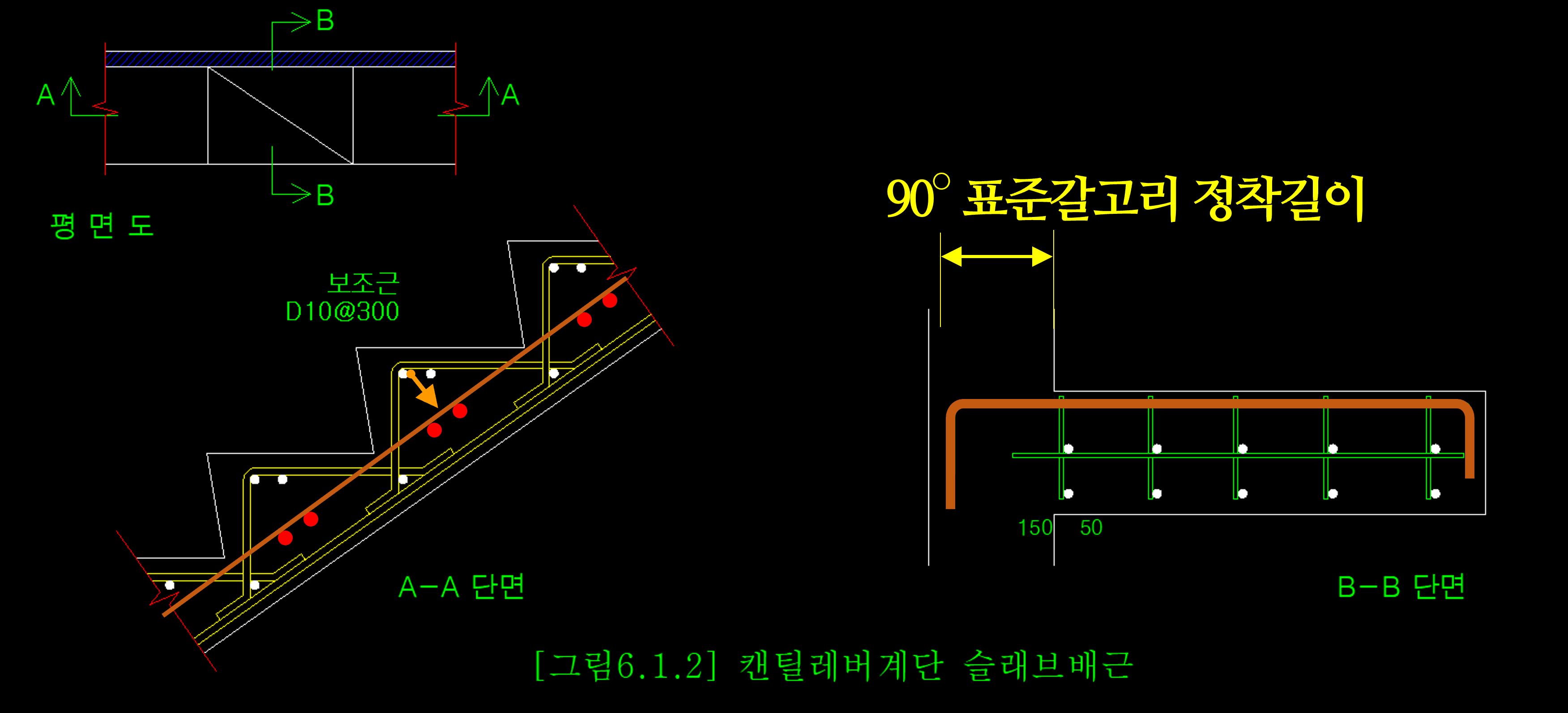 위 도면에서 A-A 단면을 보시면 상부근이 주근이 되기 때문에 디딤판 가까이까지 상부근의 위치를 올려서 배치하도록 구성되어 있습니다. 그런데 사실 현장에서는 이렇게 경사진 계단을 배치하기가 어렵습니다. A-A 단면에 상부 주근의 위치를 고정하는 보조근도 배치해야 하니까 더욱 배근하기가 어려워집니다.