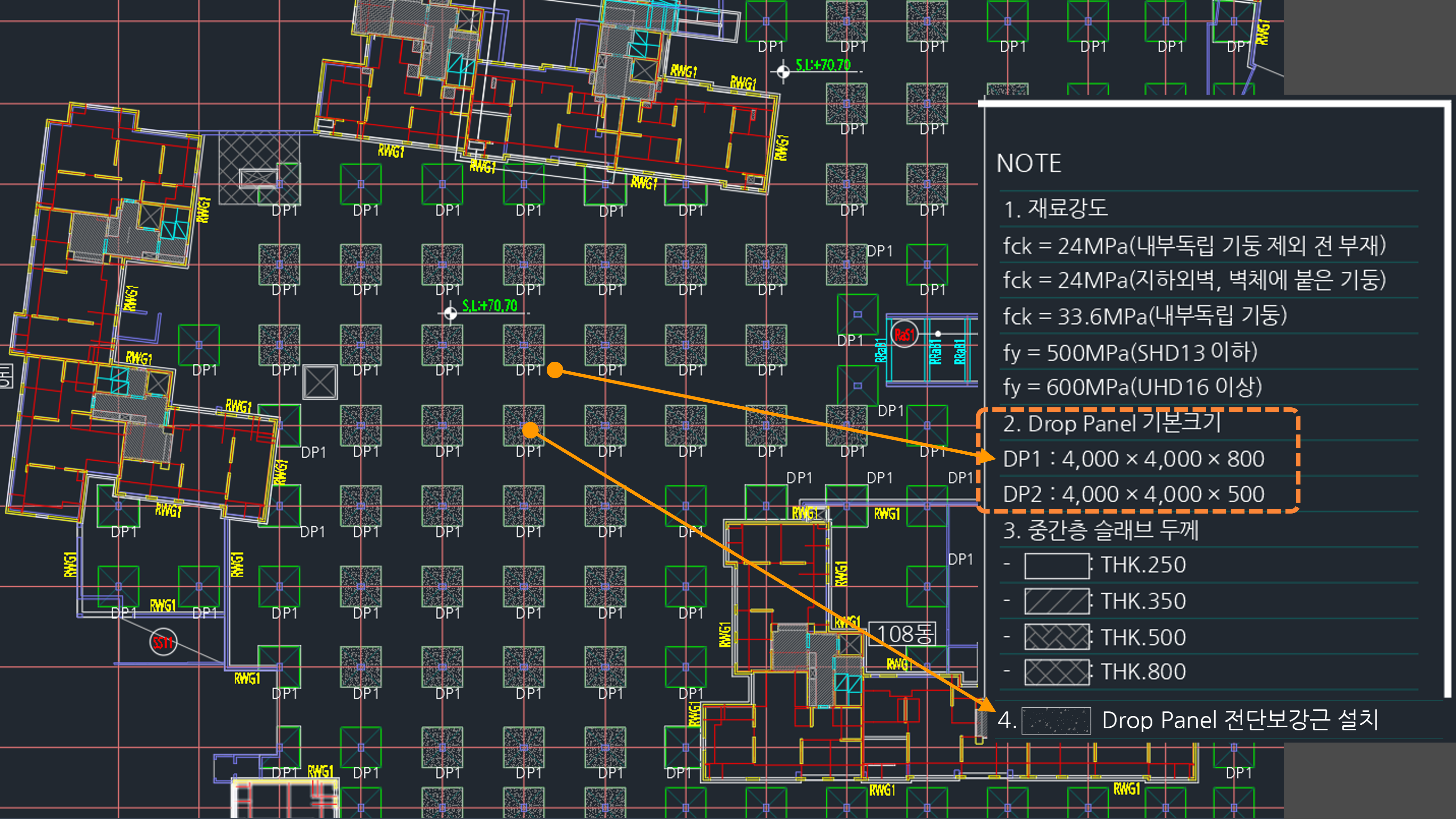 다음 사례를 보시면 지하주차장 지붕층에 드롭패널 1번을 설치해야 하고 드롭패널 1번은 2번보다 두께가 두꺼은 800짜리인 것을 알 수 있습니다. 그런데 드롭패널 1번도 음영이 있는 것과 없는 것이 있는데 이렇게 음영이 있는 것은 전단보강근을 설치하도록 되어 있습니다.
