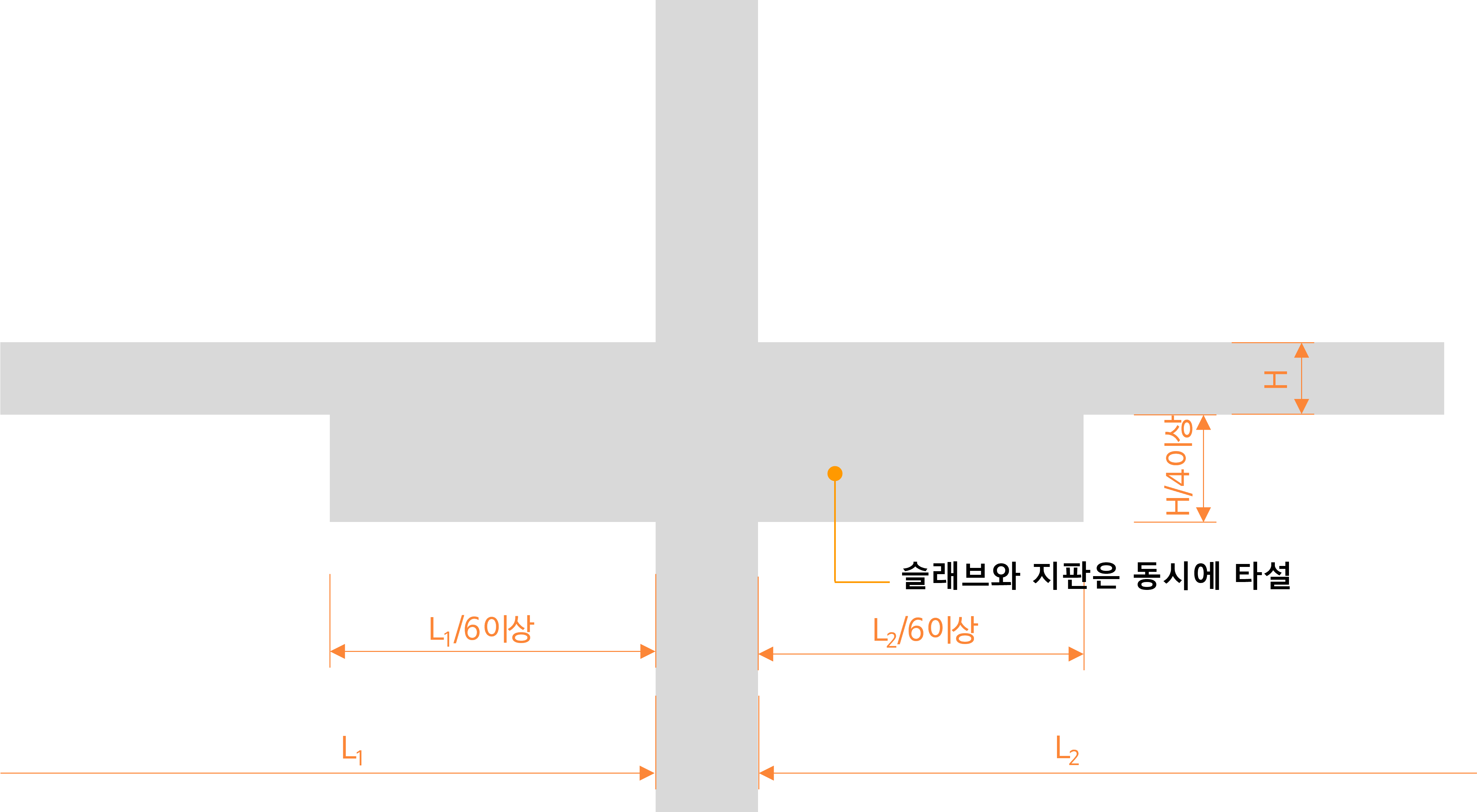 구조설계기준에서는 지판을 만드는 기준을 정하고 있습니다. 슬래브 두께를 H라고 하고 양쪽 순경간을 L1, L2라고 하면 지판의 높이는 슬래브 두께의 1/4보다는 두꺼워야 하고, 또 순경간의 1/6보다는 크게 만들어야 제 역할을 할 수 있다고 규정하고 있습니다.