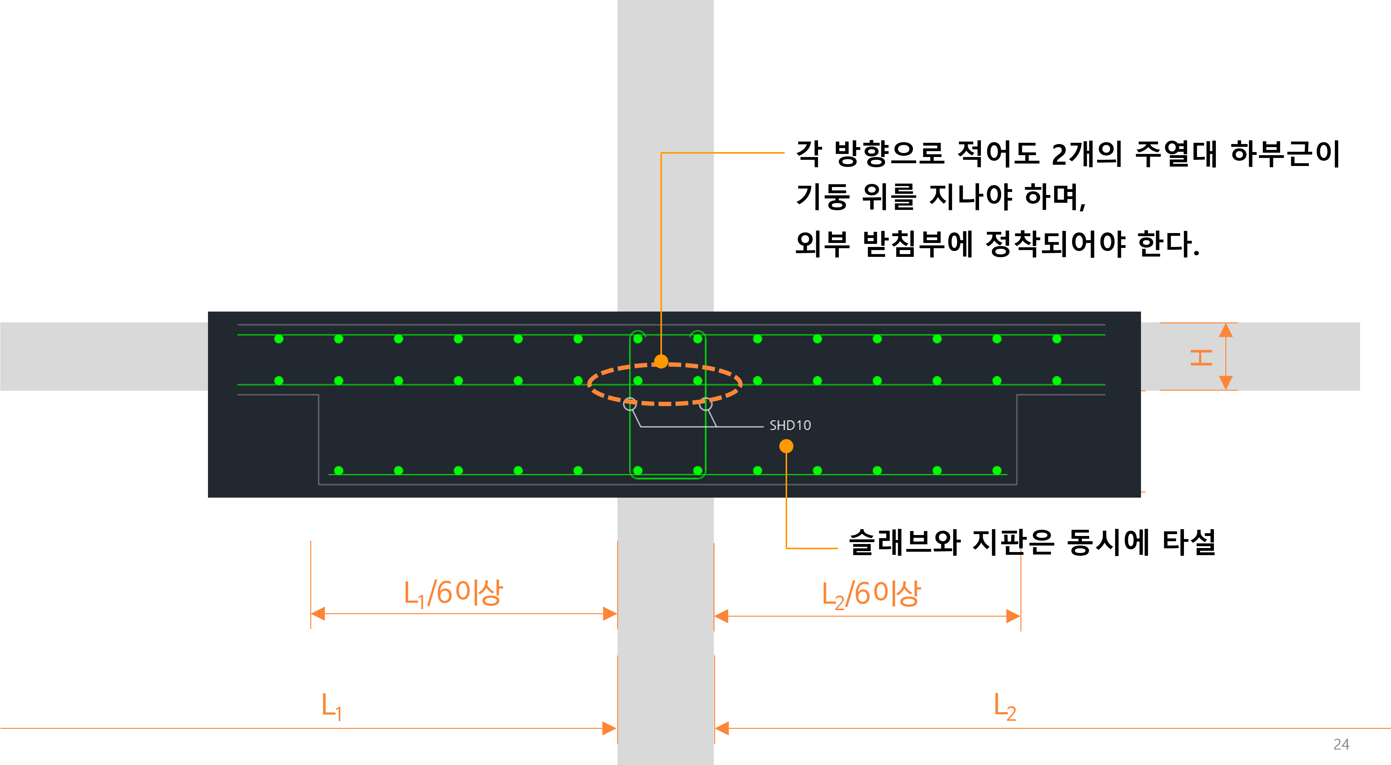 또 뚫림전단에 대응하기 위해서 신경을 써야 할 부분이 있는데요. 이렇게 지판부분의 철근을 배치할 때 주열대 하부근의 최소 2개 이상은 반드시 기둥 안쪽으로 지나가도록 배치해야 합니다. 혹시 뚫림이 발생하더라도 급격하게 붕괴되지 않도록 최소한의 연성을 확보하기 위한 것입니다.