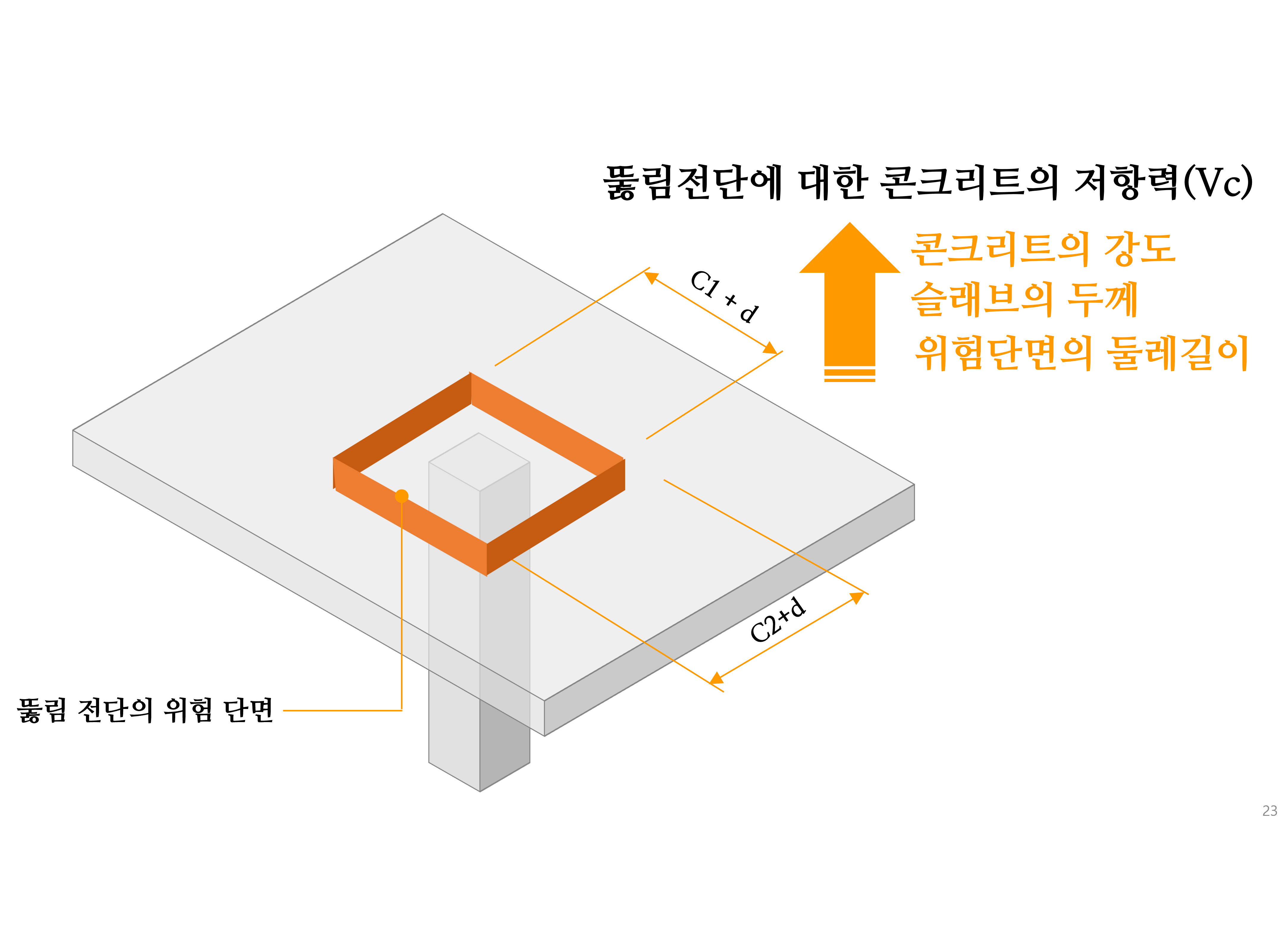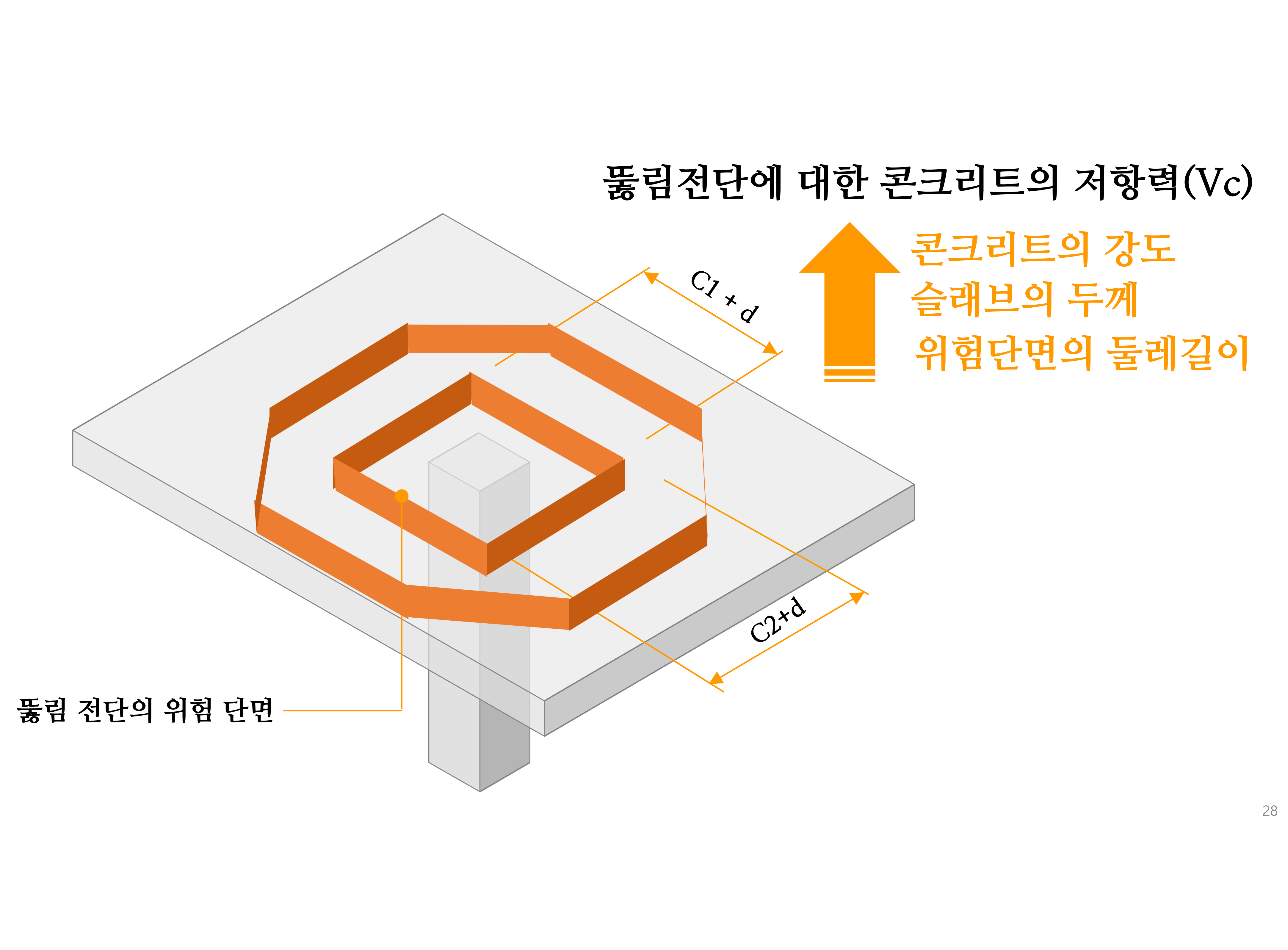 이 콘크리트의 저항력은 콘크리트의 강도가 클수록, 슬래브의 두께가 두꺼울수록, 위험단면의 둘레길이가 길수록 커지게 됩니다. 그래서 플랫 슬래브에서는 기둥 위쪽에 지판을 만들어서 슬래브 두께를 키우는 것입니다.
