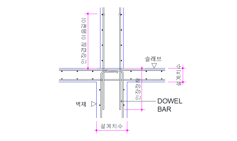 이 경우에 수직 철근을 구부리면 복원력이 발생하기 때문에 절곡해서는 안 됩니다. 하부층 철근은 표준갈고리를 만들어 정착하고, 상부층 철근은 다우얼 철근을 매립한 후 인장 이형철근의 겹침이음길이만큼 이어서 배치합니다.
