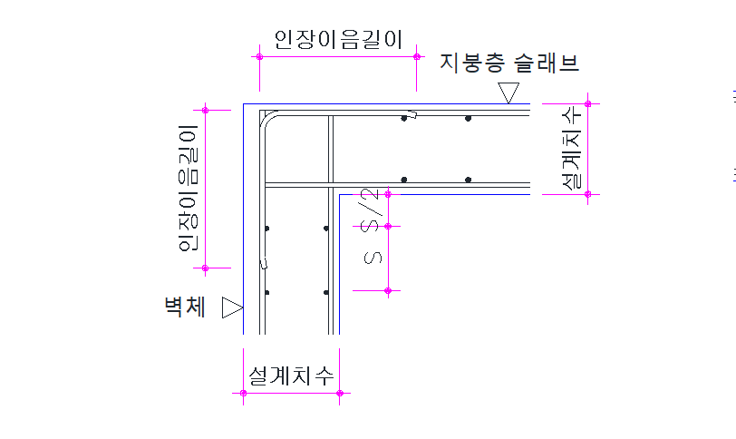 외부 벽체와 지붕층 슬라브가 면한 경우는 다음과 같이 철근을 배치해야 합니다. 벽체 수직철근을 보면 갈고리에 해당하는 부분 전체가 인장 이음길이를 확보할 수 있도록 배치합니다.