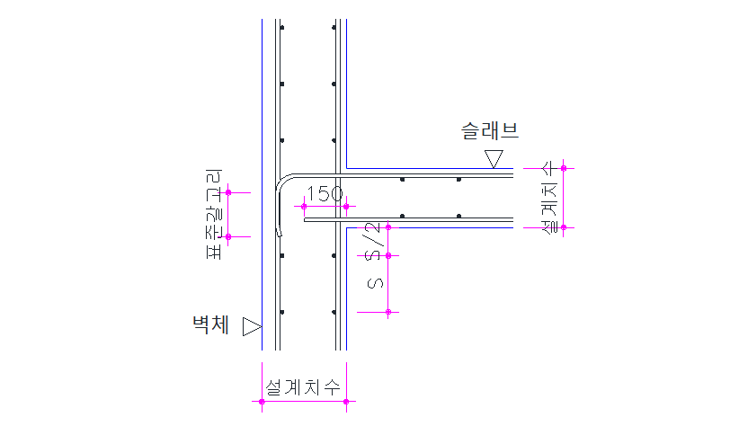 외부 벽체와 슬래브가 연결될 경우 슬래브 상부철근은 표준갈고리를 만들어서 정착을 해야 하고, 슬래브 하부철근은 보통 150 mm 정도로 직선으로 정착하게 됩니다.