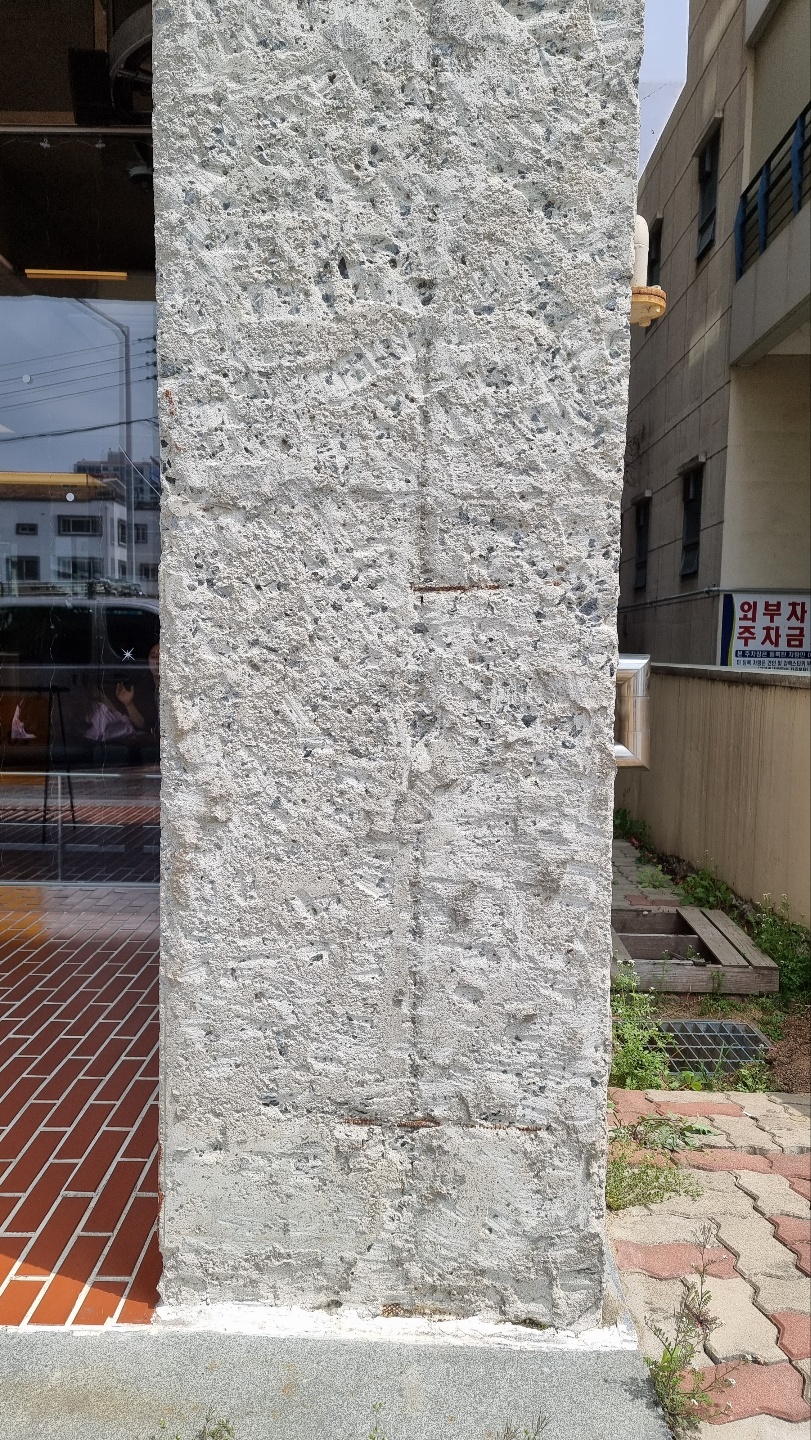 요즘 카페를 가보면 마감재를 붙이지 않고 콘크리트 표면을 그대로 노출한 디자인을 많이 볼 수 있습니다. 그런데 이 카페는 멀쩡한 기둥의 표면을 까서 일부러 거칠게 만들었습니다. 처음부터 기둥의 피복두께를 두껍게 배치하고 표면을 까내는 식으로 했다면 그나마 괜찮을텐데요...기둥의 띠철근이 표면에 노출될 정도로 콘크리트를 까낸 것을 볼 수 있습니다.