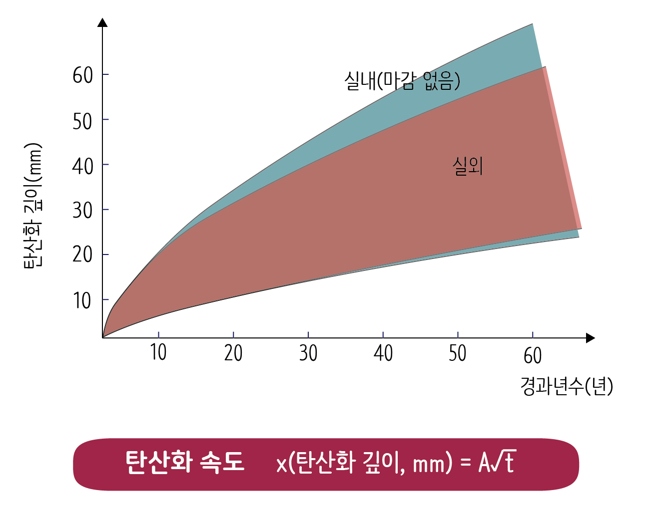 실내 환경에 따라 달라지겠지만 콘크리트의 탄산화가 40mm 정도 내부로 침투하는데 50~60년 정도는 걸린다는 것을 알 수 있습니다. 그래서 우리는 건물의 수명을 대략 50~60년 정도로 잡고 보나 기둥 같은 주요 부재의 최소 피복두께를 40mm로 정하고 있습니다.
